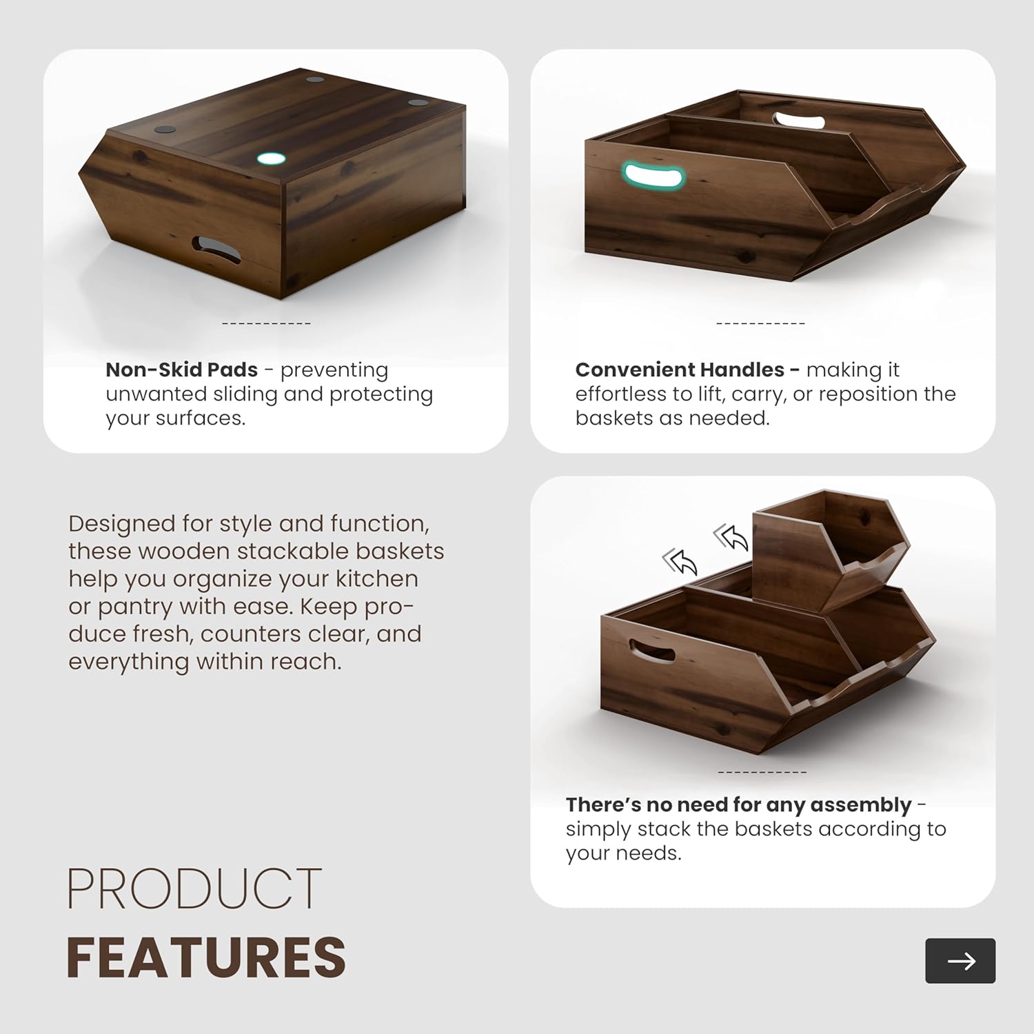 - Non-Skid Pad: Each bin is equipped with a non-skid pad on the bottom, securing that the wooden baskets stay securely in place, whether stacked or used separately