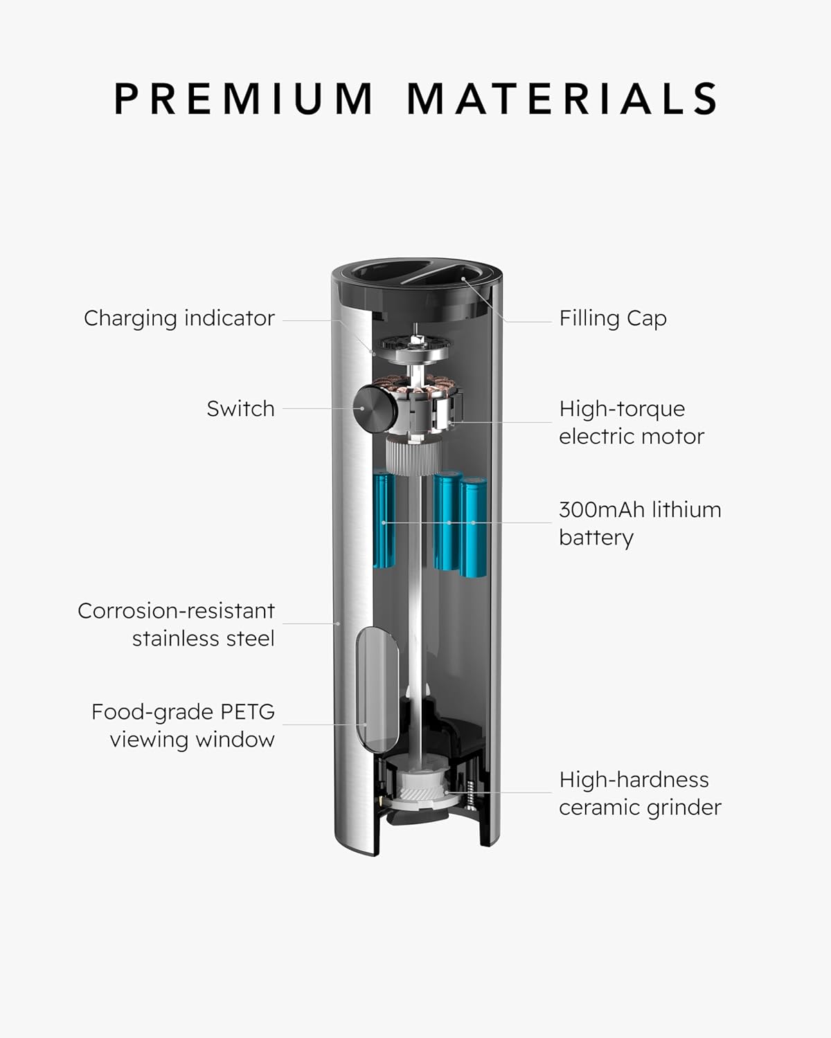 - 【Premium Stainless Steel & Transparent Storage】Crafted with durable stainless steel, this electric pepper grinder offers a sleek and stylish look. The PETG container allows easy visibility of remaining spices, so you always know when it's time to refill.