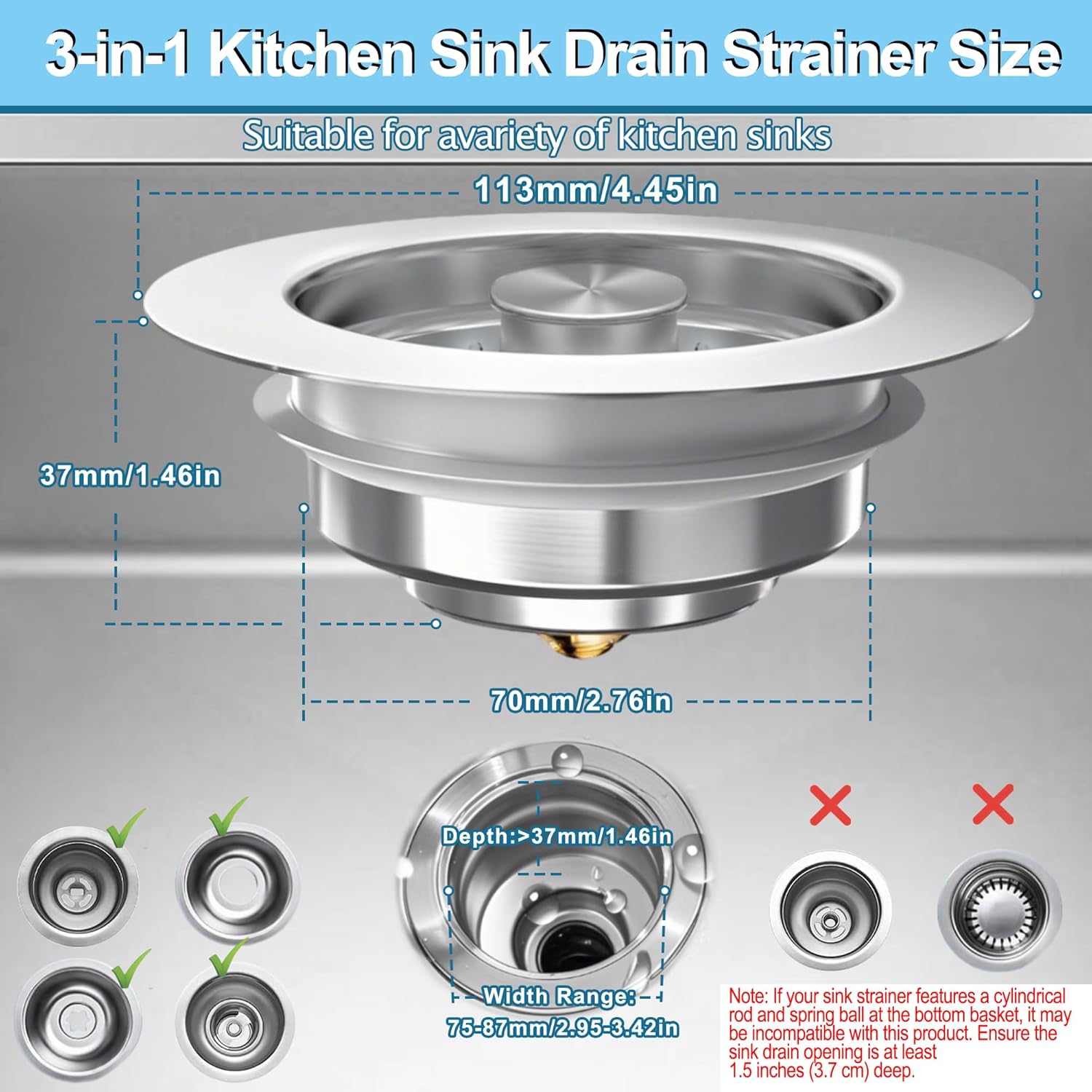 3-in-1 Kitchen Sink Drain Strainer & Stopper, Stainless Steel Food Catcher Plug with Filter Basket, Fits 3-1/2 Inch Drain Hole, Universal Sink Protector Cover, Anti-Clogging, Silver