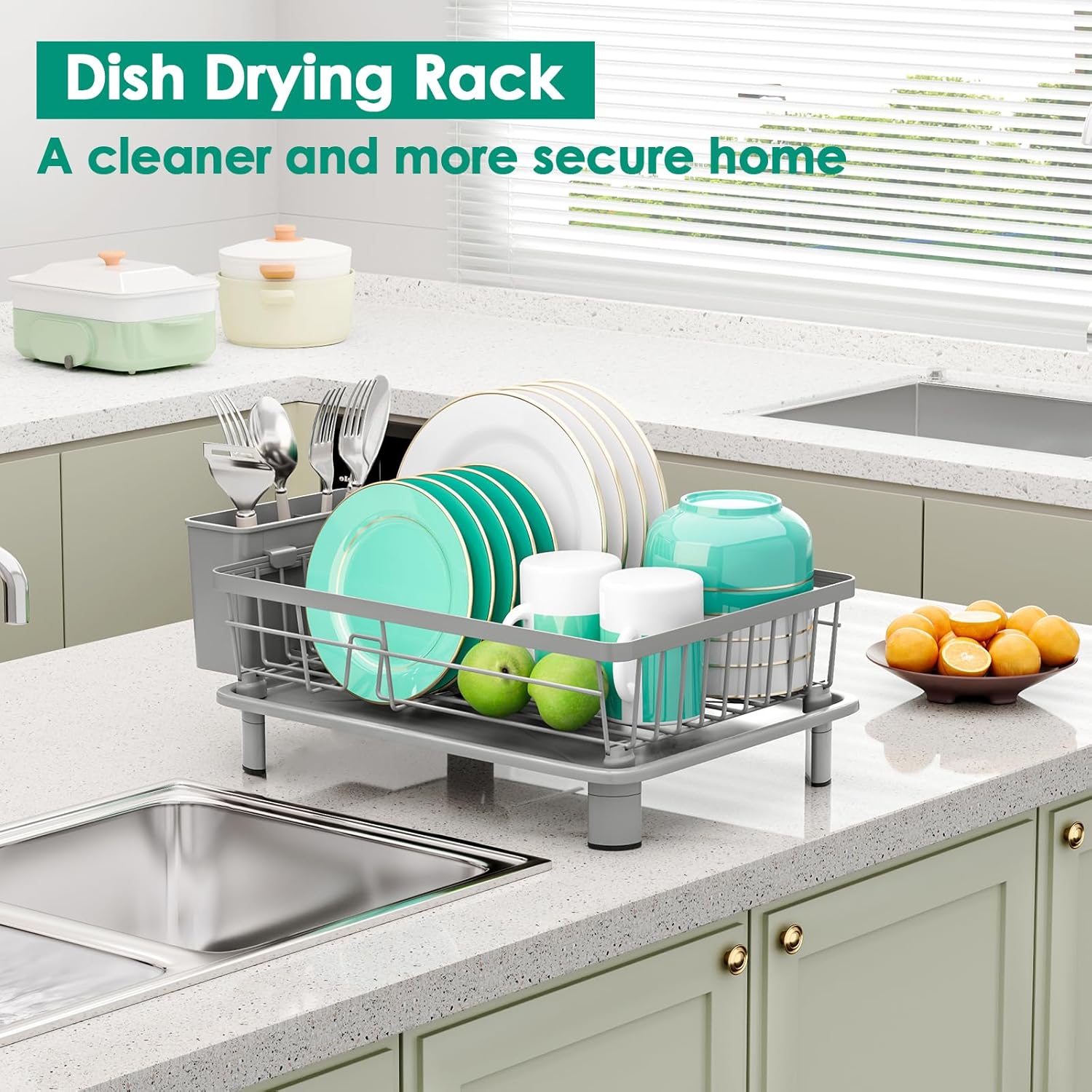 Dish Drying Rack, Space-Saving Dish Rack, Dish Racks for Kitchen Counter, Kitchen Dish Drainers with Removable Utensil Holder,Plate Rack and Drainboard, 11''W x 15''L, Gray