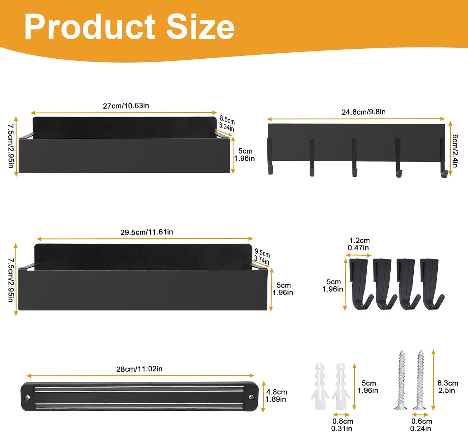 - PACKAGING:We offer 4 combination needs to meet the different items in your kitchen for categorization as well as placement needs.There are 2 colors(black,white) and 2 combinations (First,2 magnetic spice rack-large,medium,1 magnetic towel holder,1 whiteboard,3 markers-black, red, blue,4 removable hooks;Second,2 magnetic spice rack-large,medium,1 magnetic long hook, 1 magnetic knife rack, 4 removable hooks).