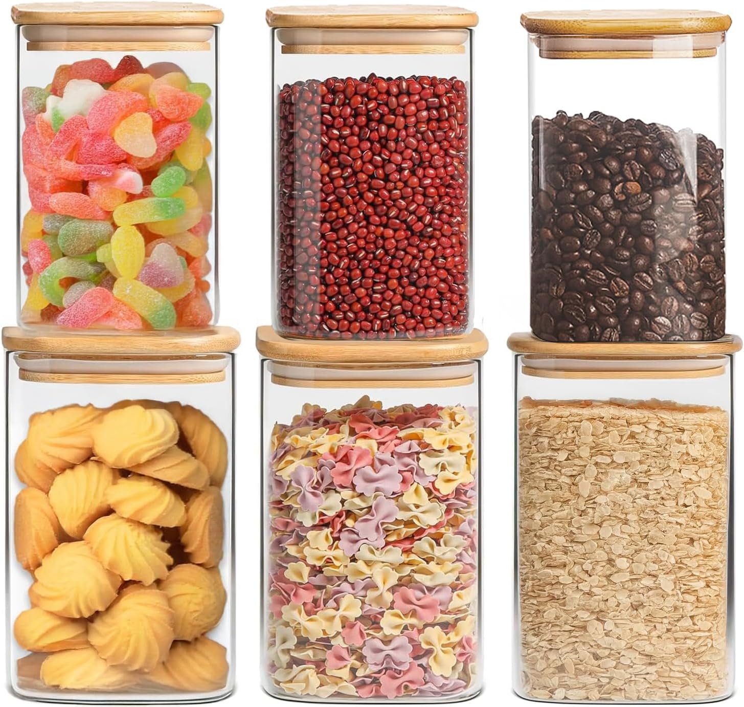 38 oz Glass Food Storage Jars with Airtight Lids, Clear Glass Jar with Bamboo Lid, Airtight Food Canister for Tea, Candy, Coffee, Sugar, Cookie, Snack. (Square| 5+6 Inch) SET of 3