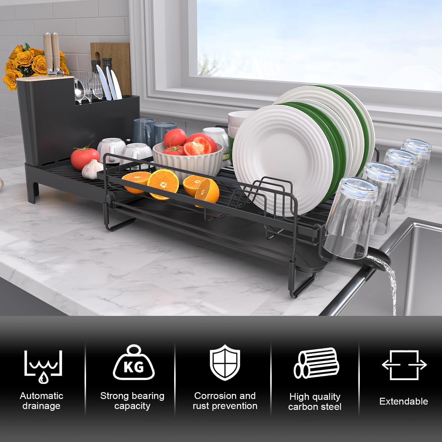 Runnatal Large Detachable Dish Rack with Drainboard Set, Dish Drying Rack Extendable Dish Rack, Utensil Holder, Cup Holder, Expandable Dish Drainer for All Kitchen Counter