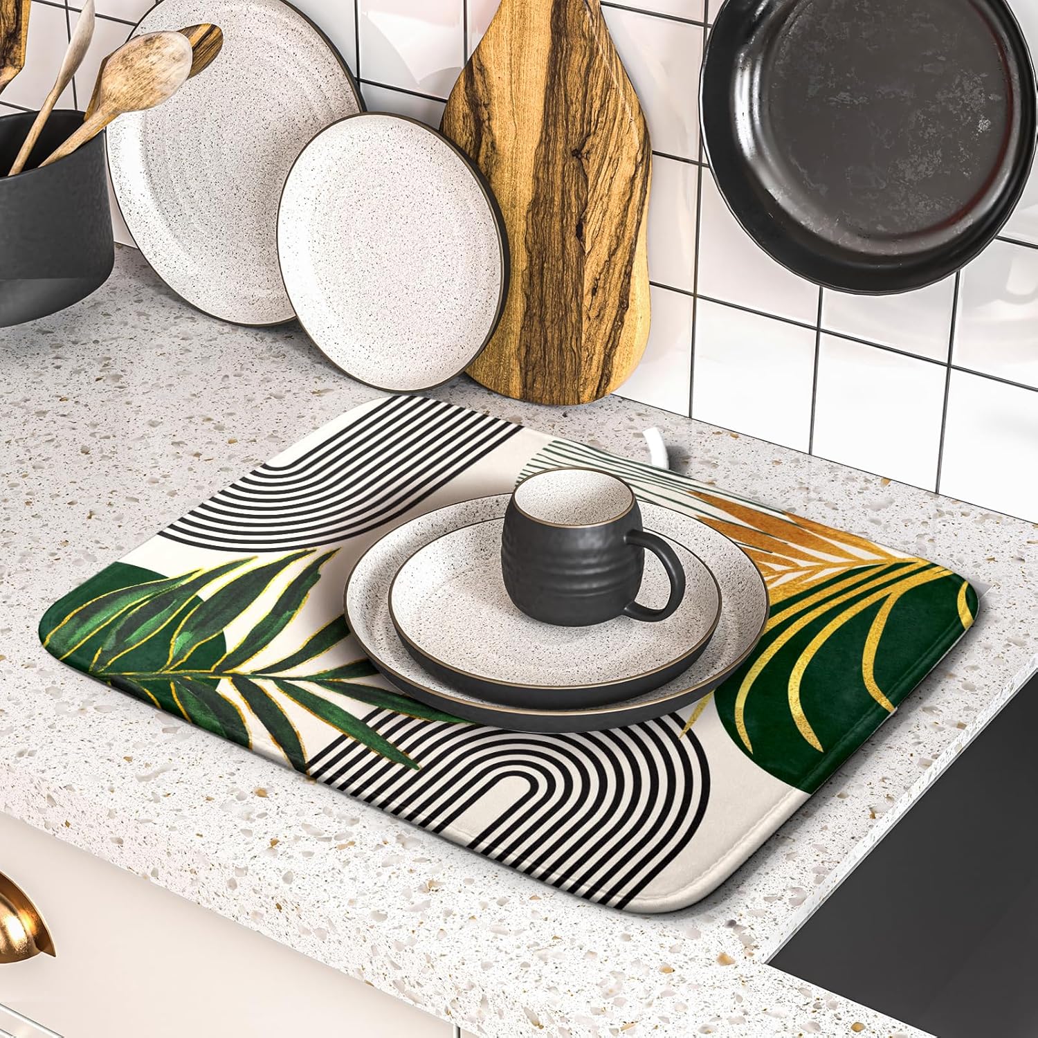 - 【Protect Tableware】Place your dishes on it or under dish racks, the abstract boho dish mat prevents bowls, glassware, and more tablewares from being scratched or worn, can be used as dish drying mat, sink mat, dishes drainer mats to keep the countertop dry and tidy.