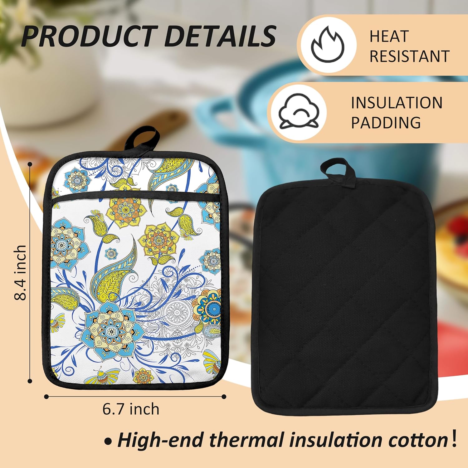 Boho Floral Oven Mitts Set, Vintage Luxury Blue and Gold Flower Floral Heat Resistant Kitchen Oven Gloves for Baking and Cooking,Pot Holders