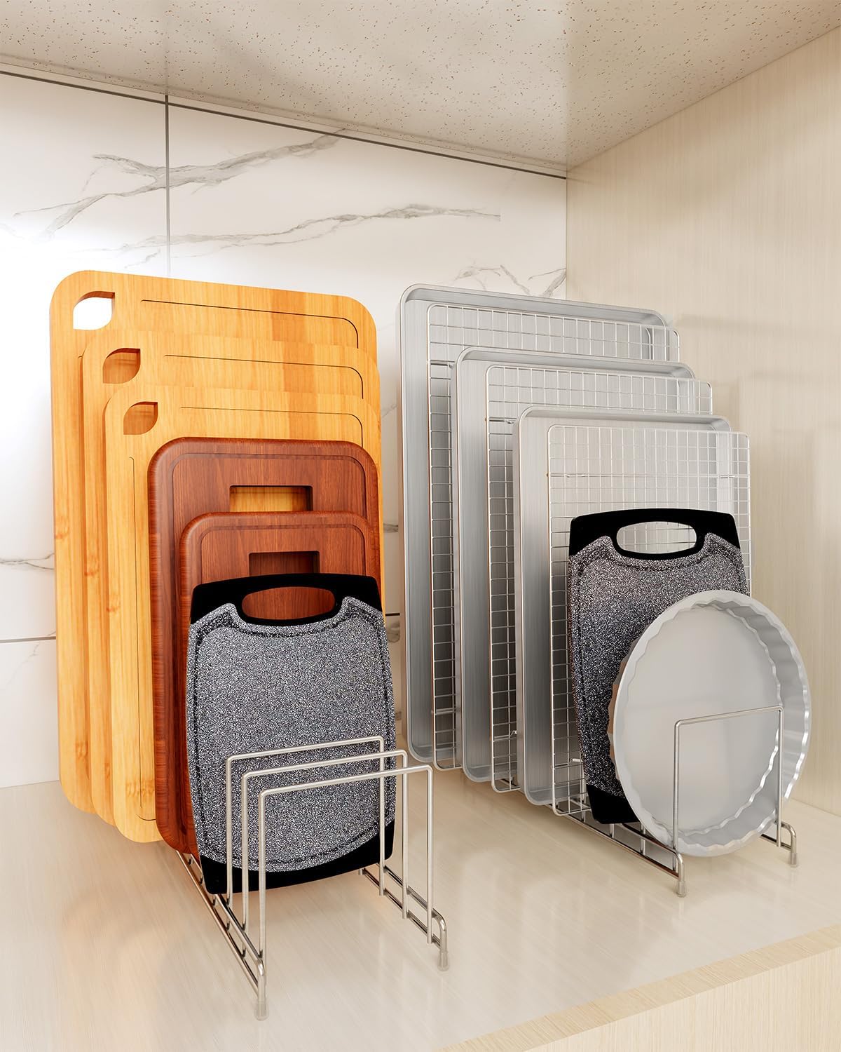 - VERSATILE STORAGE: Efficiently organizes cutting boards, bakeware, cookie sheets, serving trays, and pan lids in kitchen cabinets or countertops