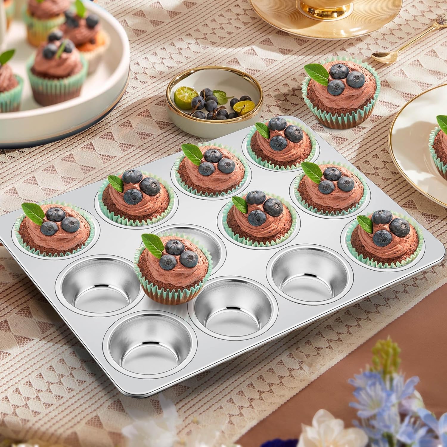 - Versatile baking, 13.75 x 10.4 inches muffin baking tray with 12 baking cups fits most toaster ovens, great for baking cupcake, quiche, mini meatloaf, custard, tart, egg bites, banana muffins, cheesecake and more, you can always surprise your family and guests with delicious treats
