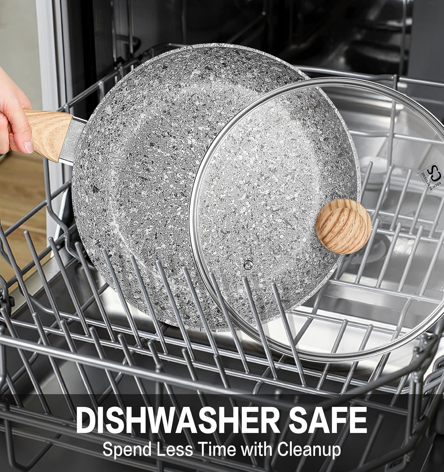 KOCH SYSTEME CS Nonstick Frying Pan with Lid, 12 Inch Grey Granite Frying Pan with Non-toxic Nonstick Coating, Aluminum Skillet with Heat-resistant Bakelite Handle, Induction Compatible, Oven Safe