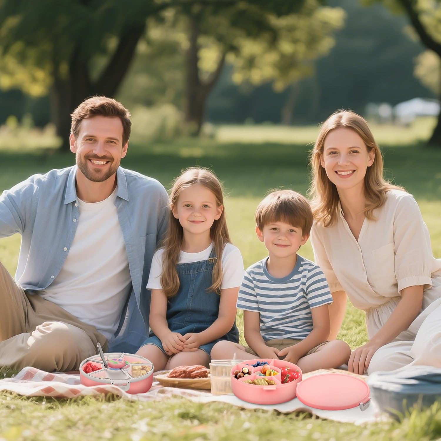 - 2 Unique Snack Containers — One features a fun snack spinner with an interactive button and 5 compartments, while the other offers a simple, classic round design with 6 compartments. The basic version holds up to 720ml of food, making it perfect for families on the go.