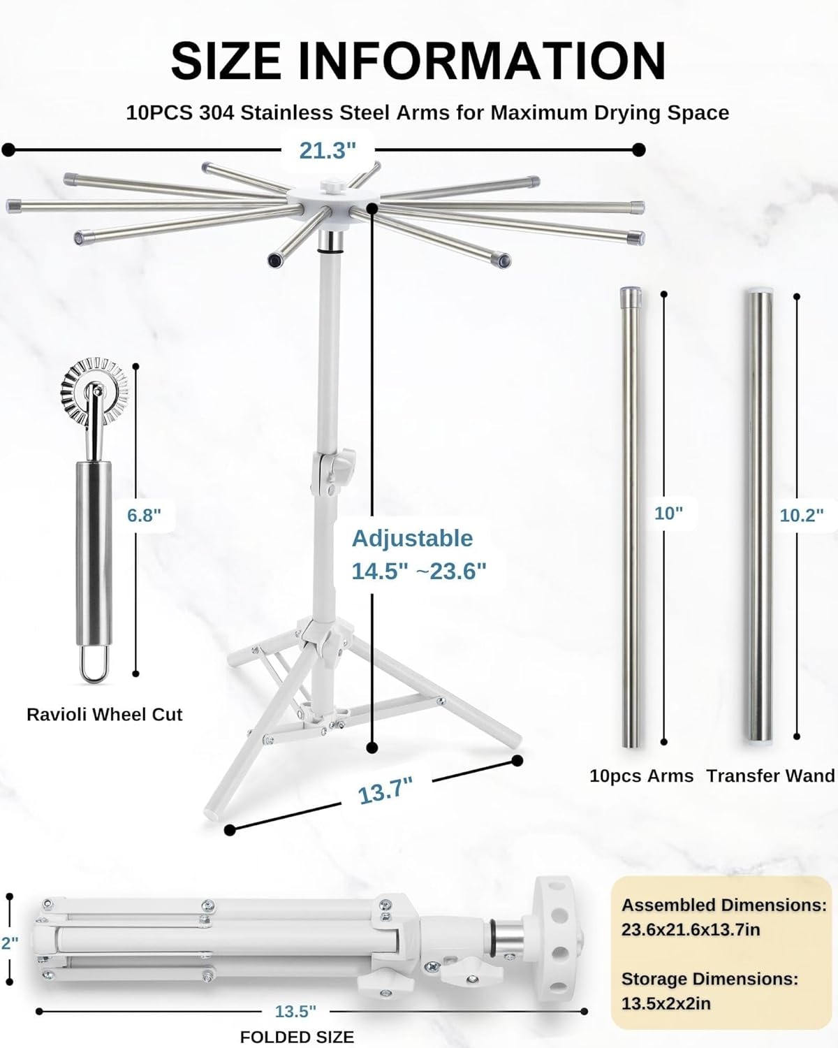 - ✔ 360° Rotating & Adjustable Height Design: Our innovative foldable pasta drying rack is engineered for versatility with a 360-degree rotating top that allows effortless access to your pasta from any angle. The adjustable stainless steel drying rods range from 14.5" ~ 23.6" in height, with10 food-grade 304 stainless steel arms(10inch) long. Suitable for drying spaghetti, tagliatelle, fettuccine, vermicelli, linguine & lasagna.