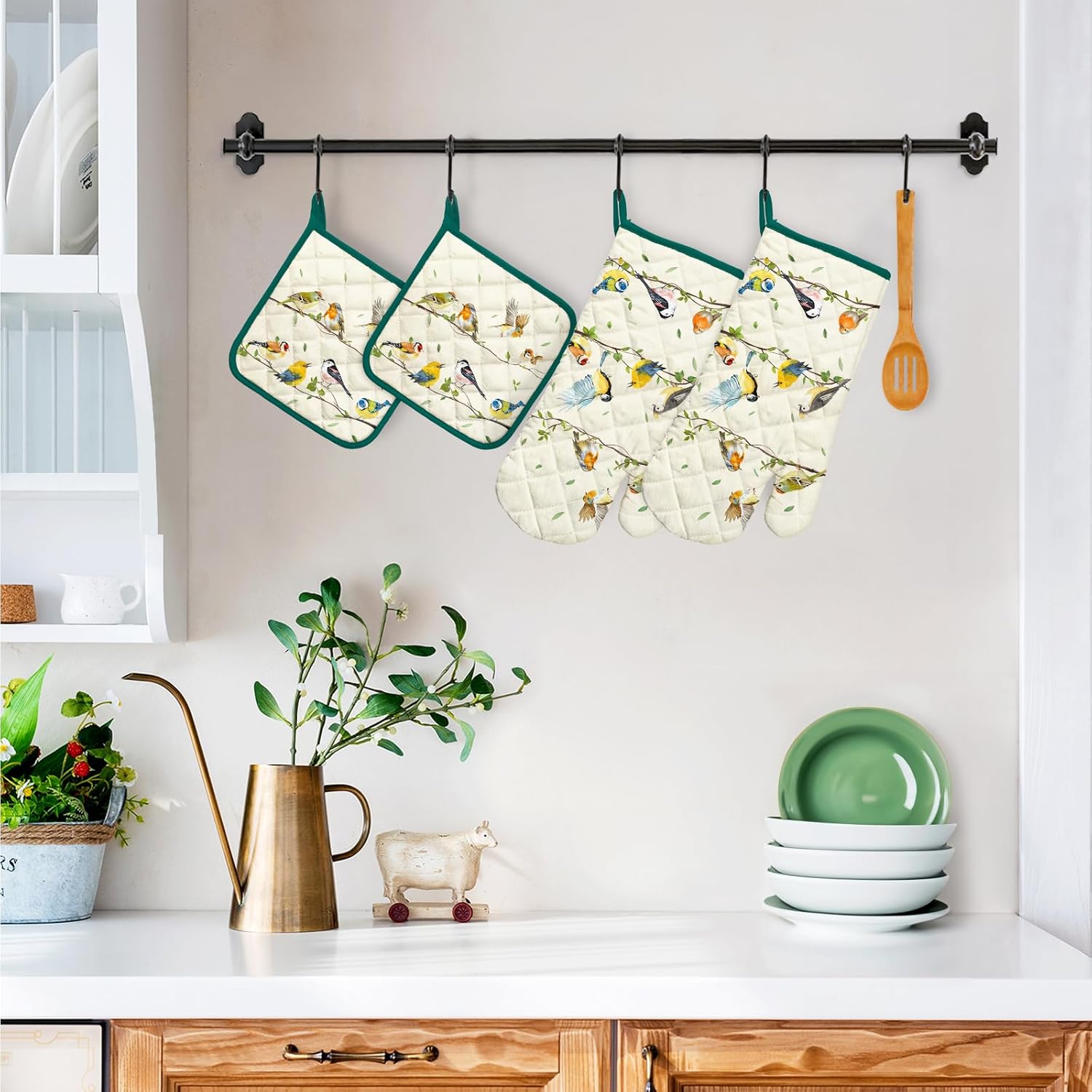 Bird Branch Oven Mitts and Pot Holders Sets 4Pcs, 100% Cotton Heat Resistant, Extra Long Oven Gloves Potholder for Kitchen Cooking Baking Decoration