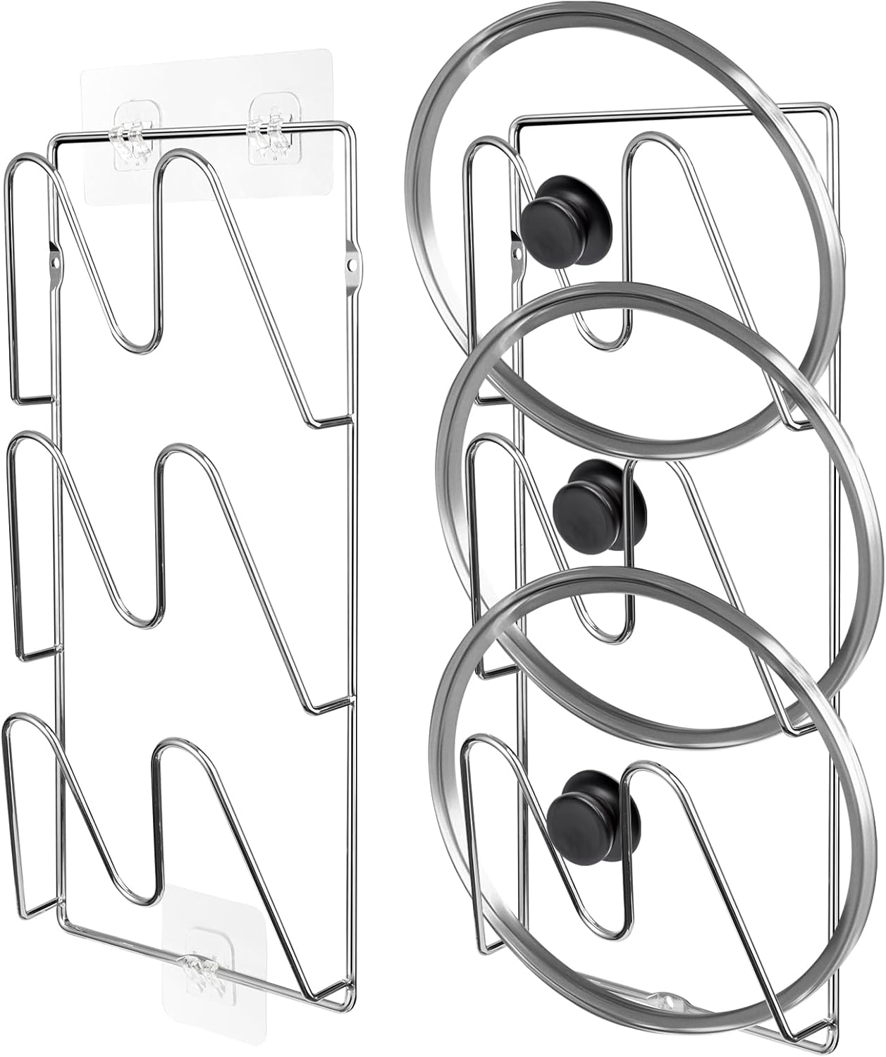 - LOSSLESS INSTALLATION: The 5.9-inch adhesive for smooth cabinets, or screw for textured walls/tiles. Install a wall mounted pot lid holders, and reheat leftovers faster than in the microwave! Great for use as a pots lid organizers inside cabinet