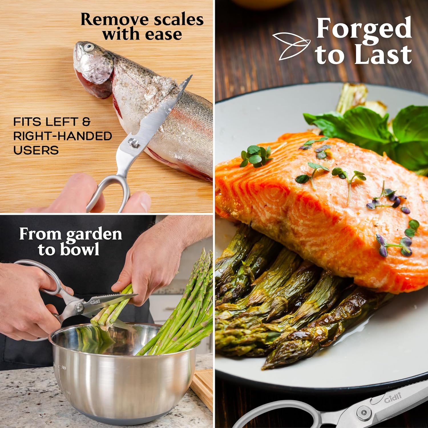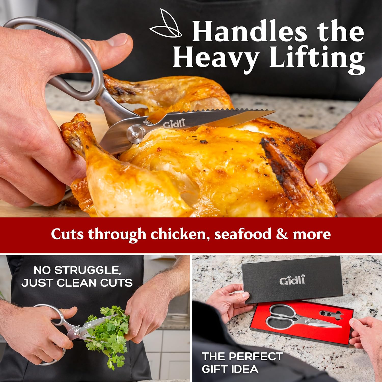 - BUILT STRONG FOR REAL KITCHEN TASKS - Gidli’s all purpose kitchen shears for food are heavy duty to slice through chicken, seafood, veggies, fruit and even tough meat. These stainless steel kitchen shears for food heavy duty prep are your go-to for everyday meals, grilling outside, or food prep at the campsite. From cutting herbs to handling raw chicken, they’re just easier than switching between knives and gadgets.