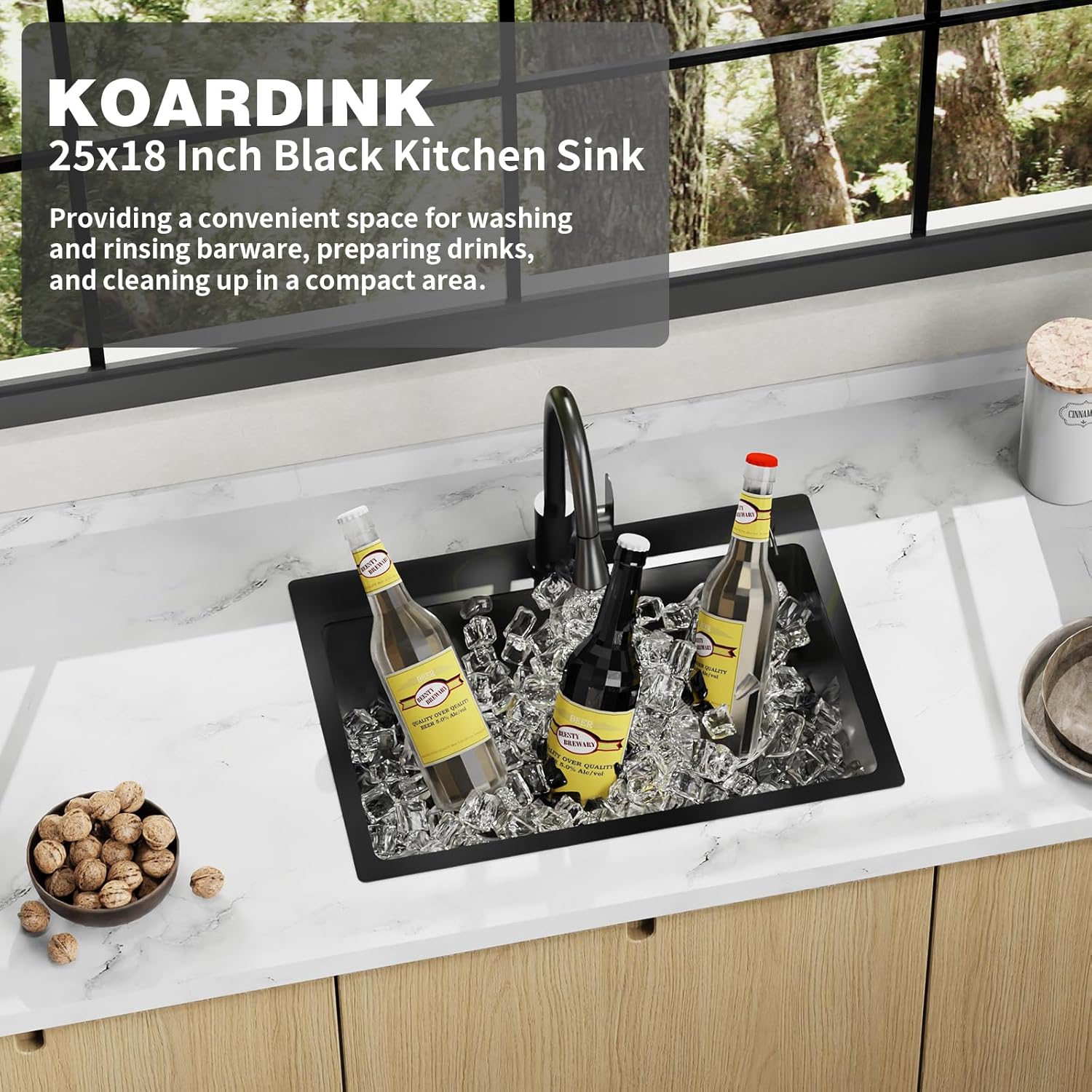 - Versatile Compatibility: 25x18 in black kitchen sink can work well with various countertop materials, such as granite, quartz, or marble. Stainless steel kitchen & bar sink complement various kitchen styles and designs. Whether you have a contemporary, traditional, modern kitchen or bar, a stainless steel sink can seamlessly integrate into your aesthetic.