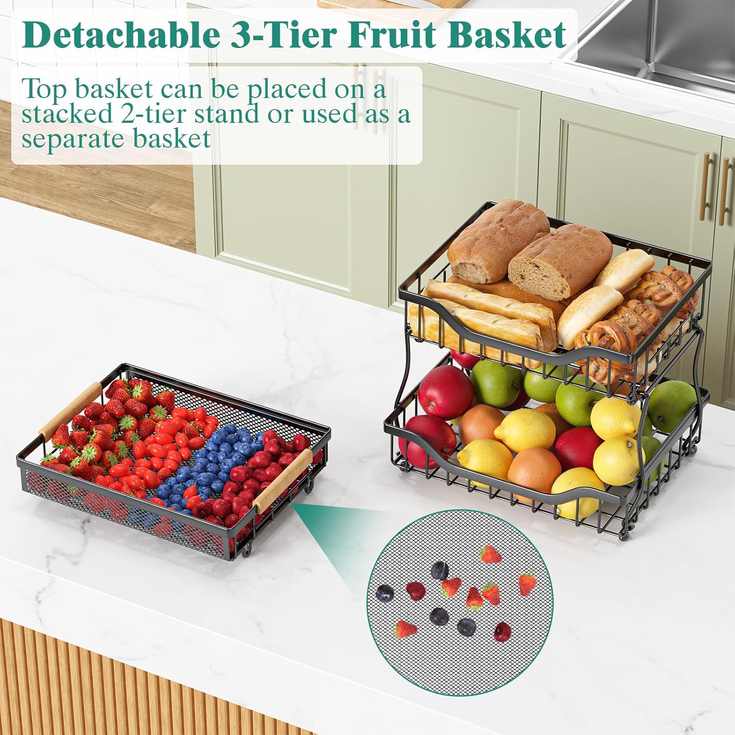 - Mesh Top Basket with Handles: Never worry about small blueberries slipping out of the wire basket. The top basket features a fine mesh grid, perfect for storing tiny items. Crafted from durable metal wire, it also includes two wooden handles for effortless transportation