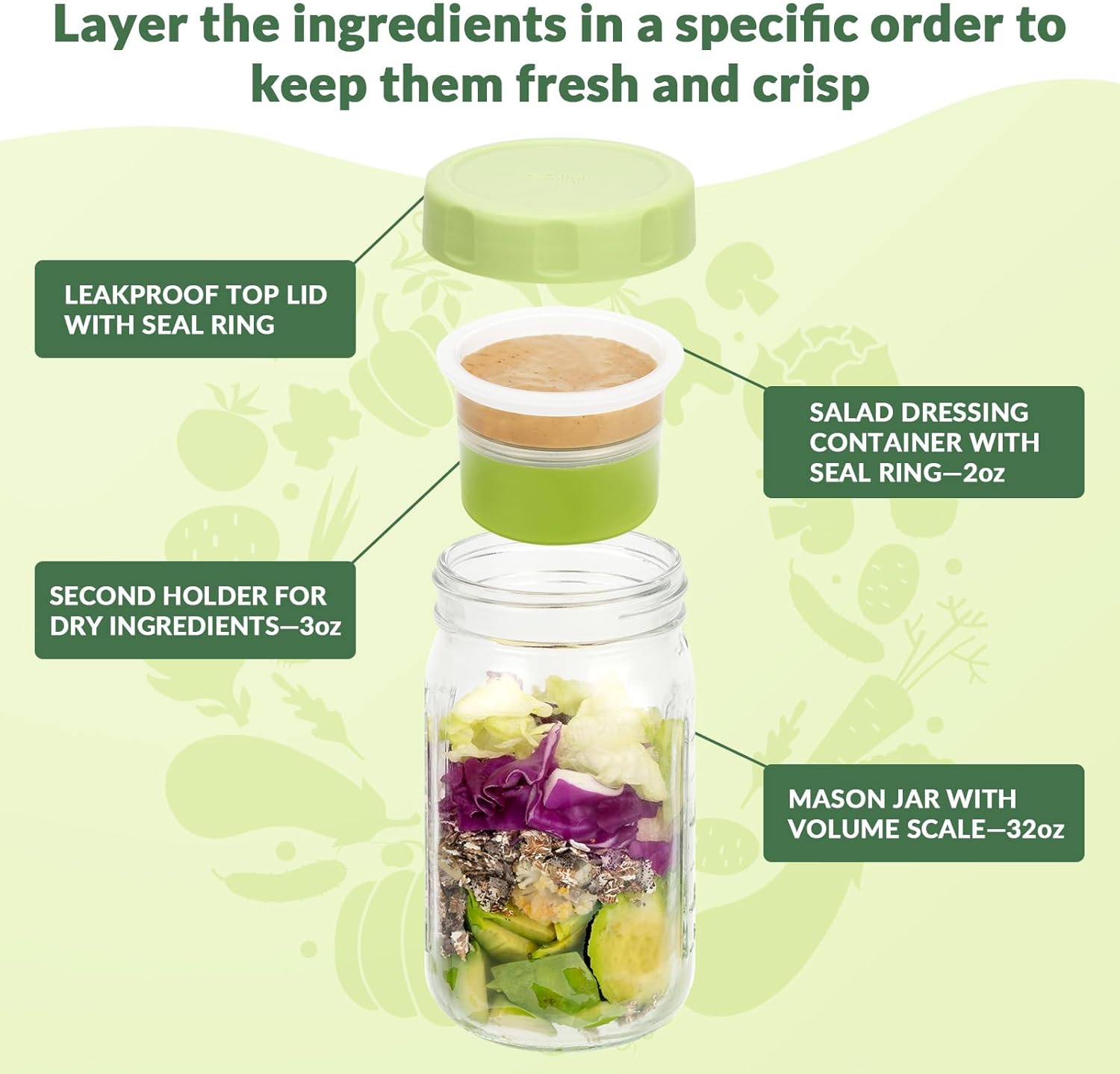 - Kitchen Saver MASON JARS - Using Wide-Mouth Mason Jars as salad prep containers makes for a more durable, eco-friendly and minimalist style, and we've added removable silicone leak-proof rings to both the top quality plastic lid and the separated salad dressing container, so feel free to shake it without fear of leakage! οΌTIPS: The jars are NON-heat resistant glass, hot liquid is not available. NOT microwave safe.)