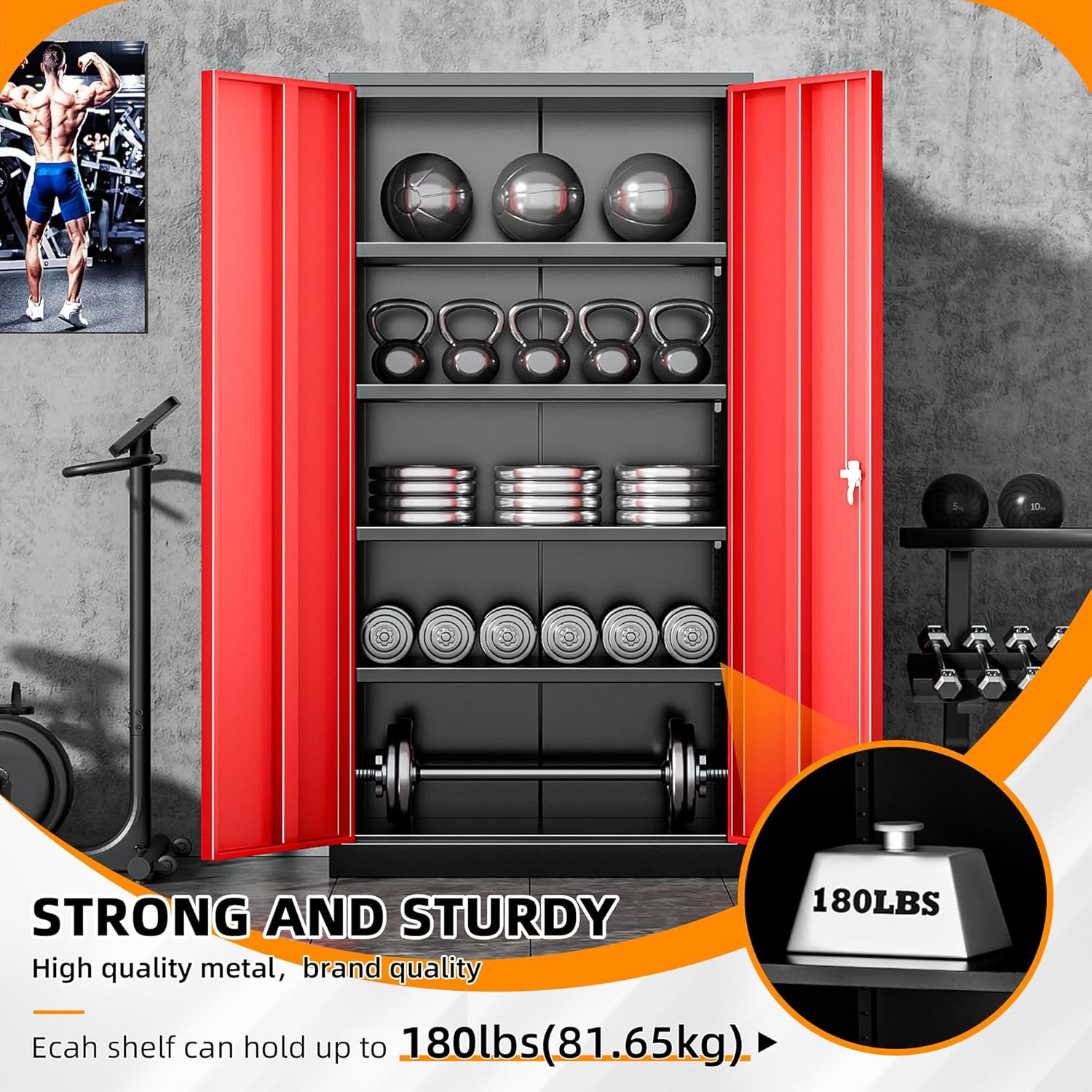 - 【4 Adjustable Shelves】:The metal cabinet is furnished with 2 doors, while the tool cabinet features 4 adjustable shelves to enhance its durability.Each shelf of black red metal cabinet can hold up to 151 lbs, to store heavy tools, files, long size items, etc.