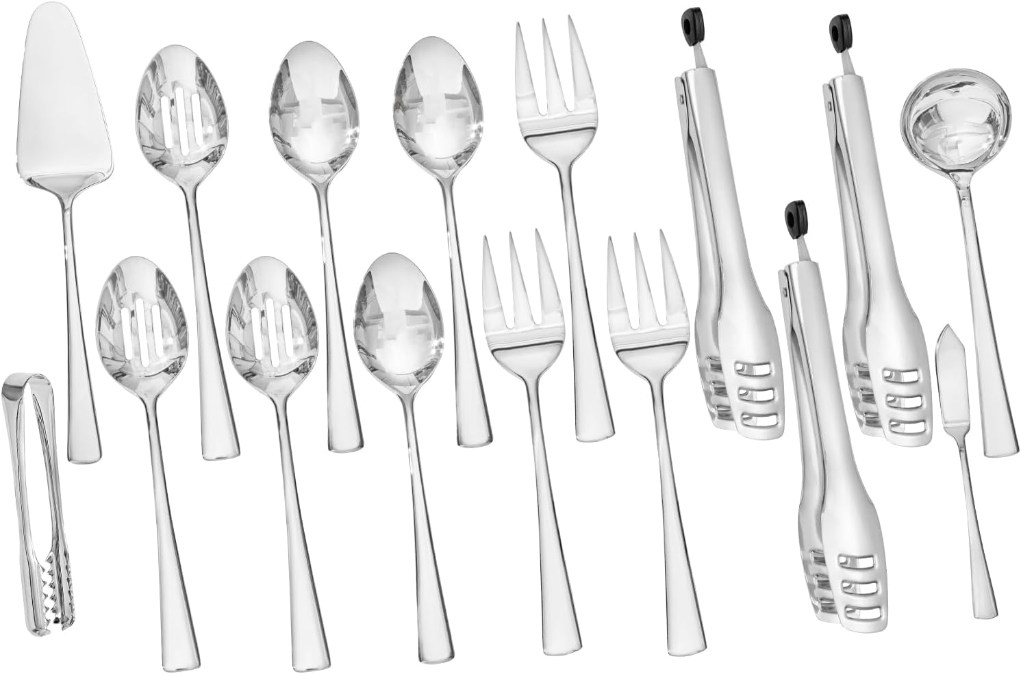 KINGSTONE 16 Piece Serving Utensils Set, 18/10 Stainless Steel Serving Utensils, Slotted Spoon, Fork, Tong, Soup Ladle, Cake Server, Butter Knife and Ice Tong for Buffet, Parties, Kitchen
