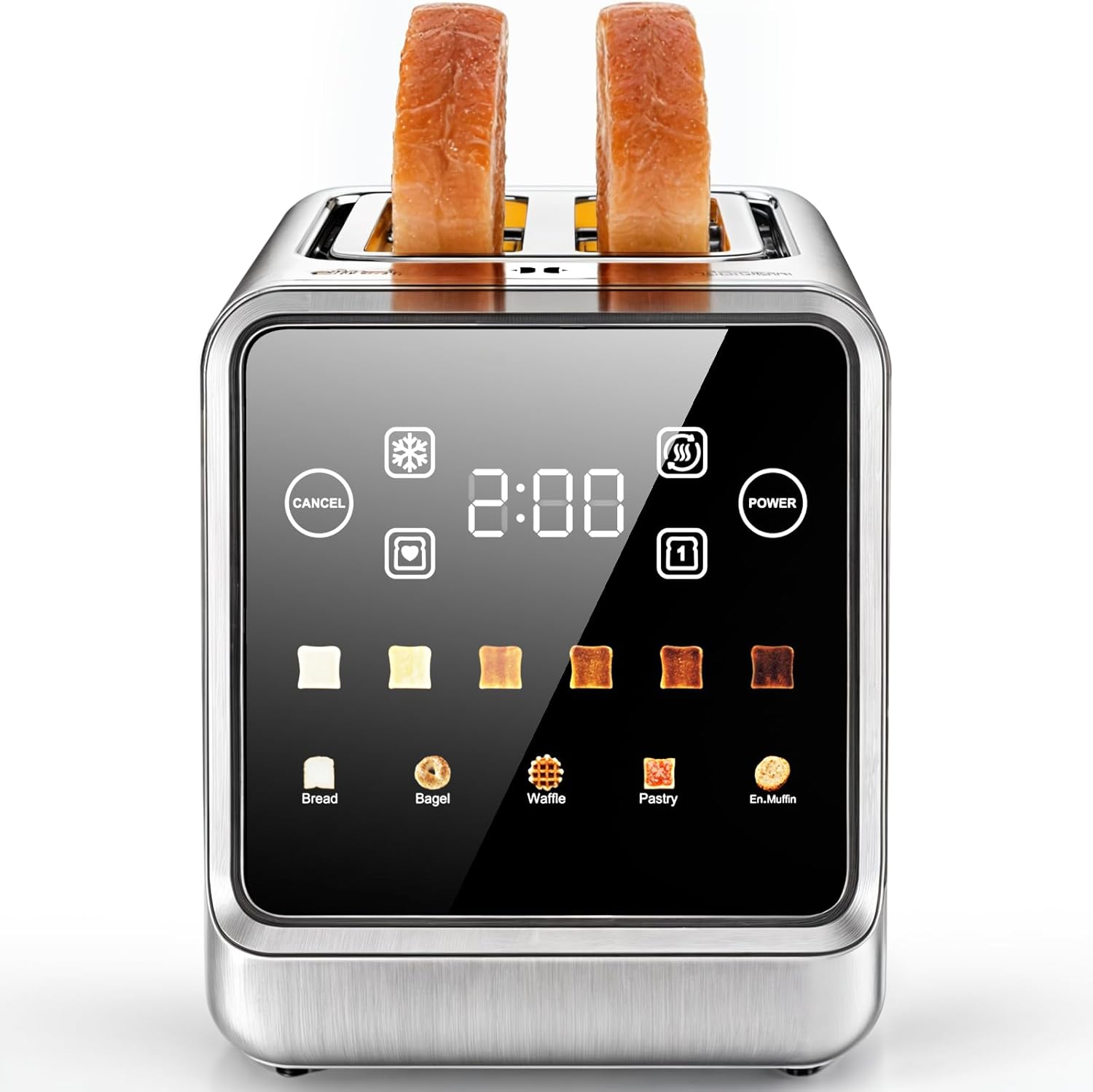 Toaster 2 Slice Wide Slot, Stainless Steel Digital Toasters Best Rated Prime, Touch Screen Toaster for 5 Bread Types/6 Shade Settings/Single Slot Toasting/Memory Function/Defrost/Reheat