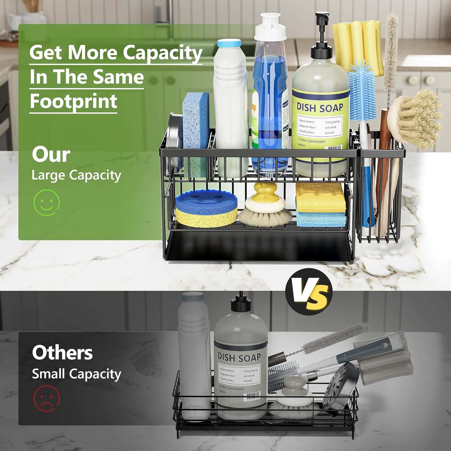 - ăDouble-Layer Storage, Bigger & Smarteră Tired of clutter around your sink? Our upgraded sponge holder offers twice the capacity of standard sink racks. It easily holds 3 soap dispenser, sponge, scrubber, sink stopper, and moreâall in one compact organizer. Our unique inclined drain board can quickly drain water into the sink without leaving any water stains, keeping the sink dry and tidy.