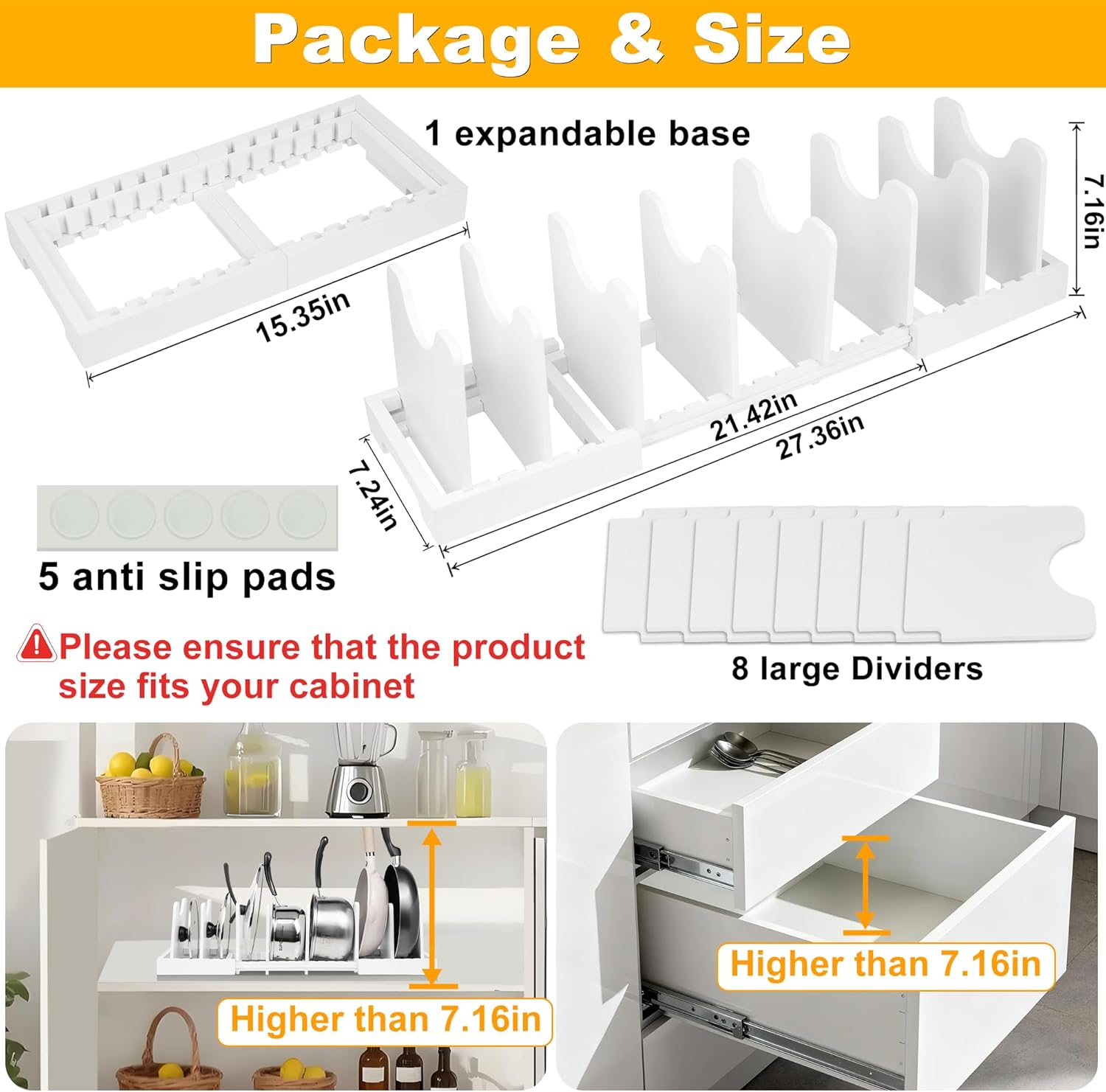 - Easy to Install:No extra tools required. Simply insert the divider into the slot. It also comes with non-slip silicone pads to protect your surfaces and prevent slipping. Equipped with 8 dividers and 25 slots, this is adjustable and expandable to fit various sizes of drawers and cabinet spaces. The non-slip mat is very stable, so you can put it on the cabinet or some other high places with more confidence, so that you can use it more at ease