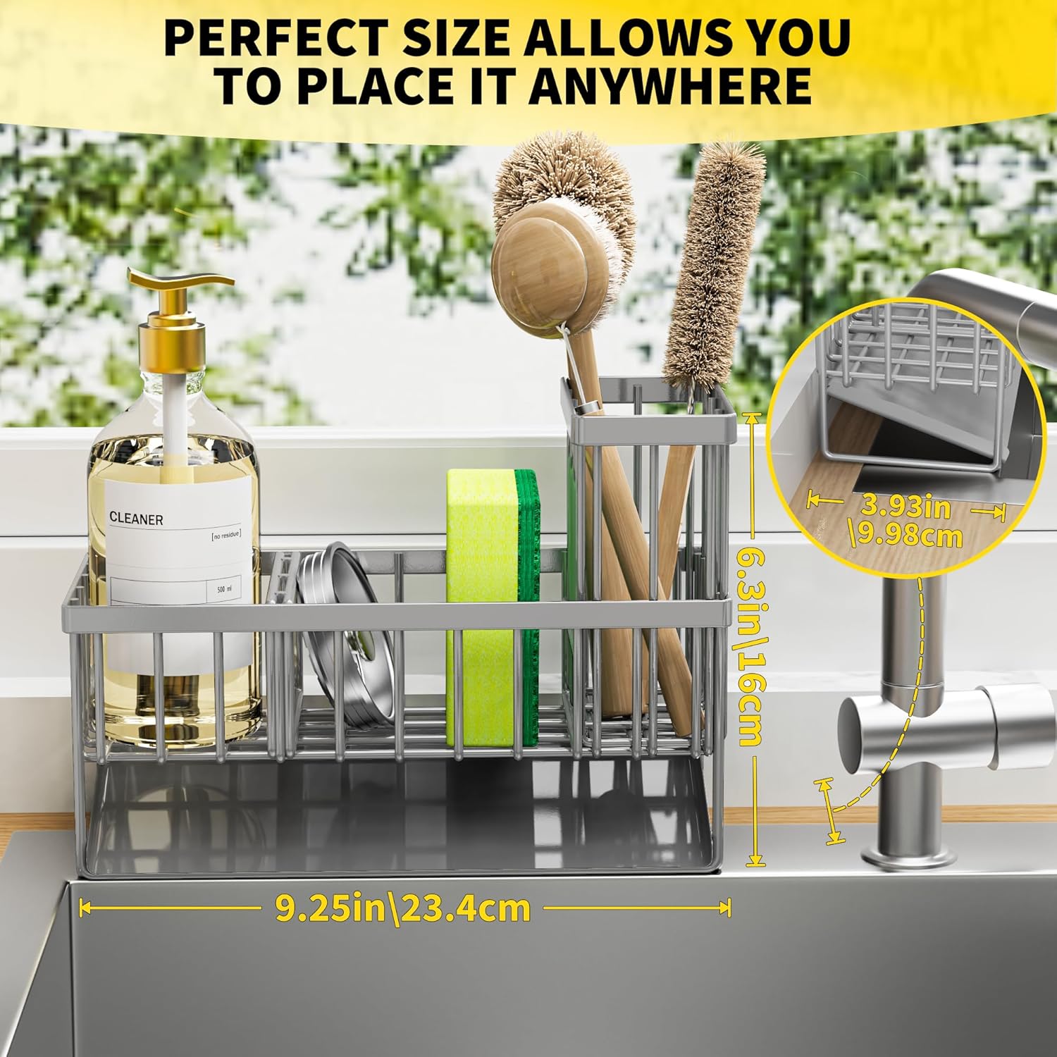 - ăSMALL VOLUMEă Cisily sponge holder is suitable for kitchens with limited space. It measures only 9.25"*3.97"*6.37", Holds a detergent bottle, a sponge ball and sink stopper. With an extra upgraded brush holder that can hold up to 4 small and large sized brushes, with the Cisily Sink caddy you can save countertop space perfectly.