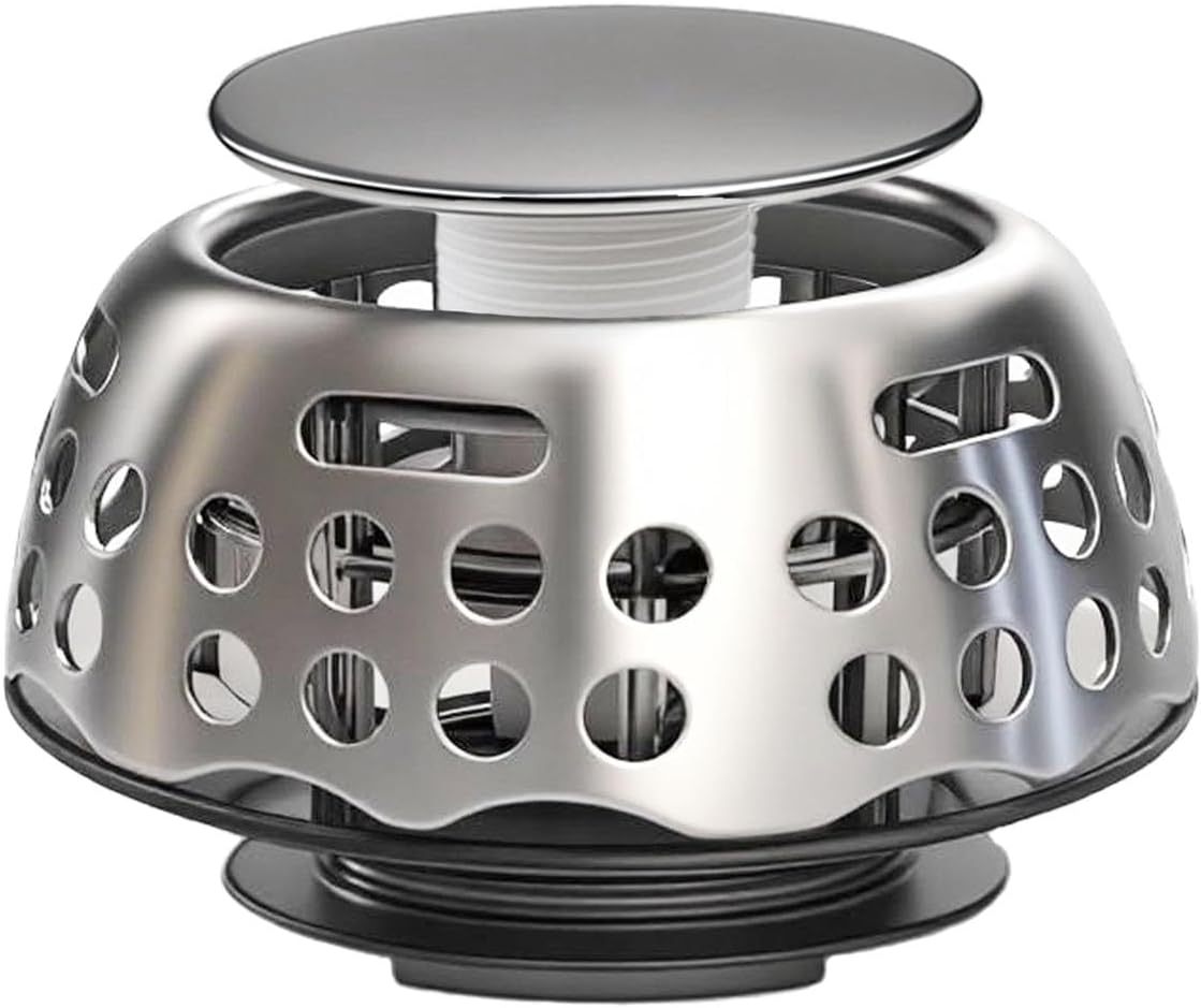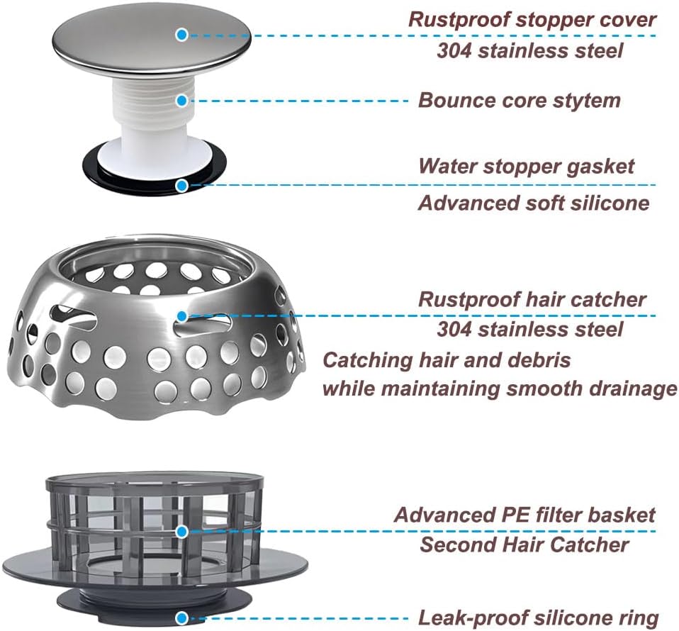 - 【DOUBLE FILTRATION DESIGN】A honeycomb filter cover made of 304 stainless steel is designed on the surface, which intercepts most of the hair and debris during the drainage process. The second filter inside this tub strainer, which is a filter basket made of advanced transparent PE material that can effectively capture hair twice. Other similar Pop-up bathtub stopper strainer that only have filter baskets, as all hair and debris will be caught in the basket, resulting in slow drainage and hard to clean. Our updated dual filtering design solves this defect, as the vast majority of hair and debris are intercepted outside the filter cover, effectively maintaining smooth drainage.