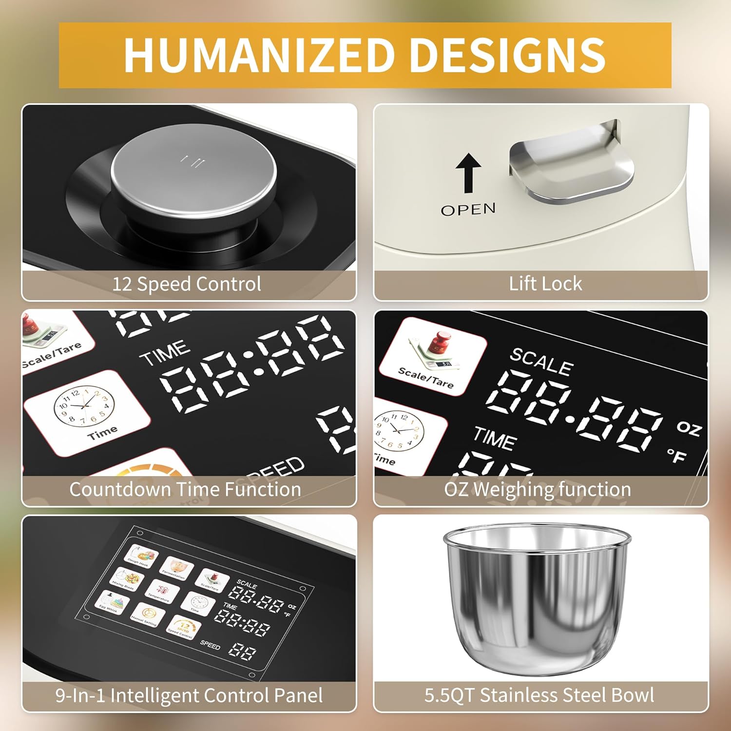 9-IN-1 Stand Mixer, 660W 12-Speed Kitchen Mixer, 5.5QT Bowl Household Food Mixers include Dough Hook, Whisk and Beater, Food Mixer for Most Home Cooks, Kitchen Scale for Baking and Most Home Cooks