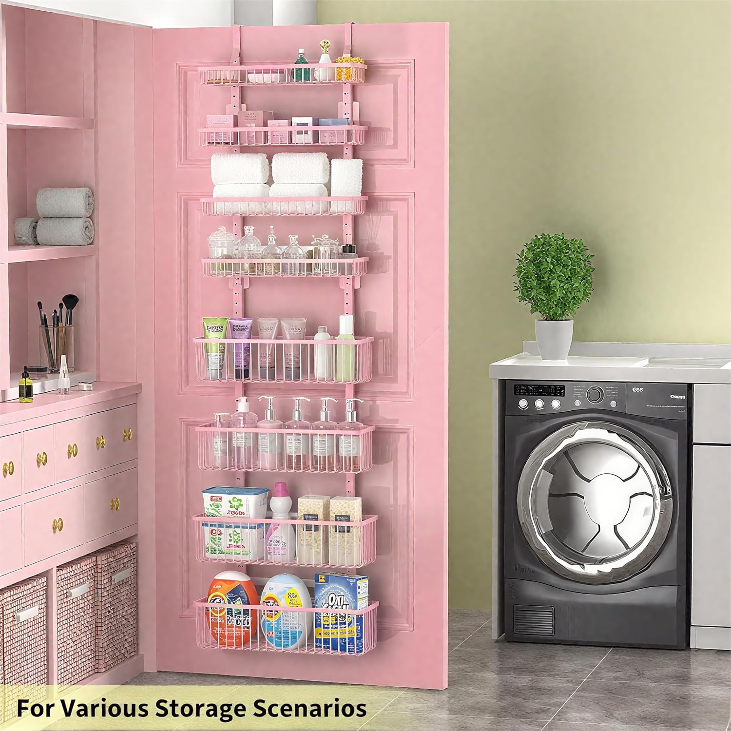 Moforoco Pink Over The Door Pantry Organizer, Pantry Door Organizer Shelves, Kitchen Organizers and Storage, Hanging Basket Wall Spice Rack Seasoning Shelves, Laundry Room Bathroom accessories