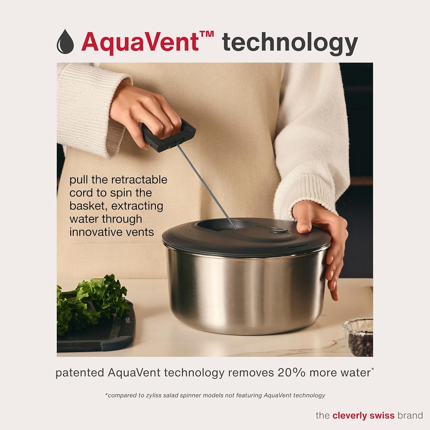 Zyliss Easy Spin Salad Spinner - Fruit & Veggie Dryer - Produce Spinner & Cleaner for Salad Prep - Dishwasher-Safe Kitchen Essential - Non-Slip Bowl with Pull Handle - New Stainless Easy Spin Small