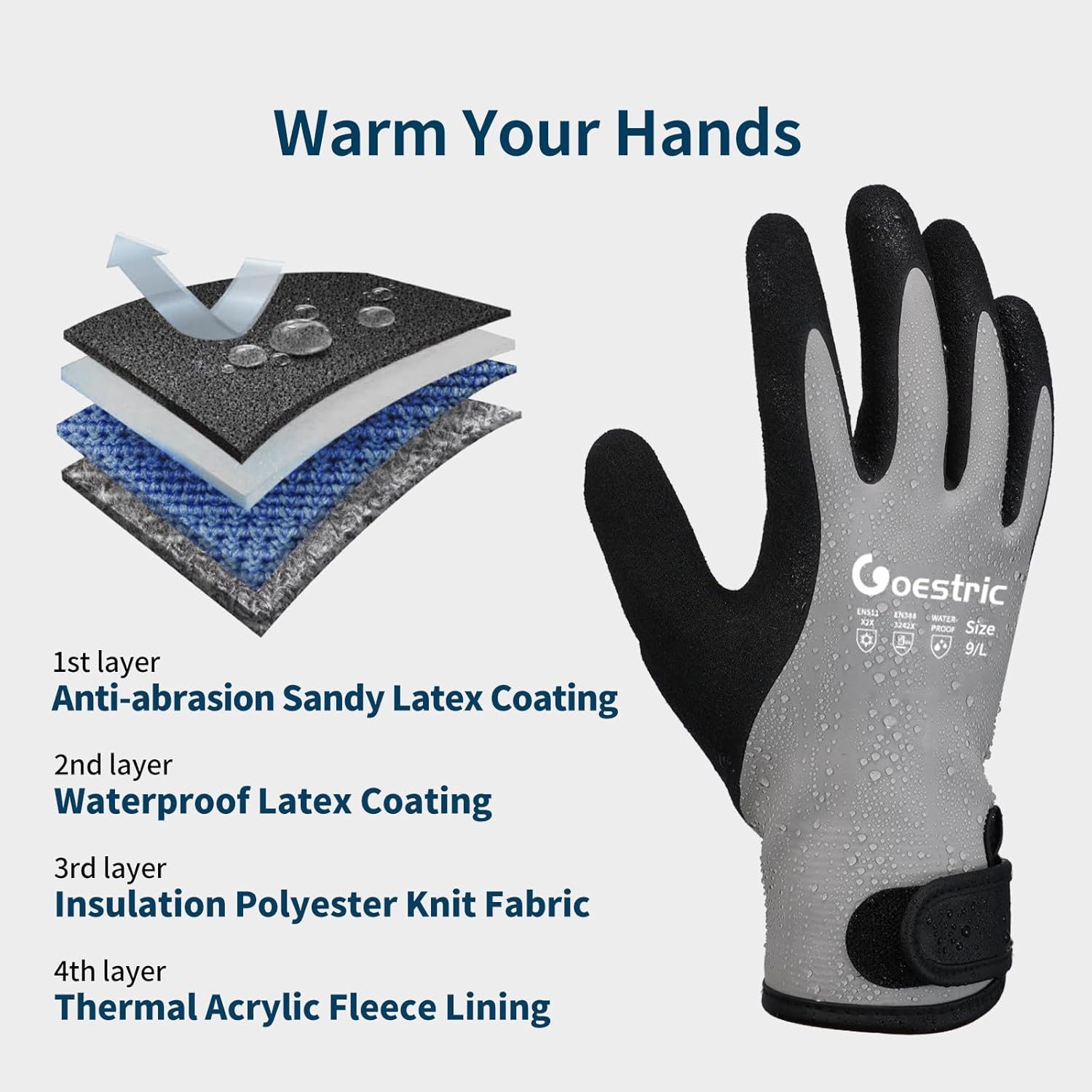 - 【Waterproof & Windproof】GOESTRIC winter work gloves feature a double-layer fully dipped latex design for exceptional waterproof performance, keeping your hands dry in any environment. They are ideal for rainy, snowy weather.(*It is not recommended to soak gloves in cold water for too long.)