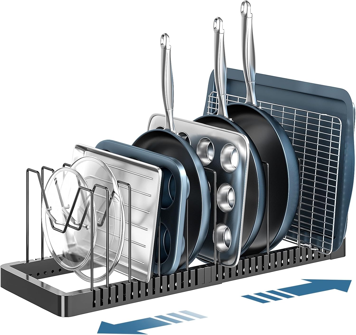 - 1-Minute, Tool-Free Assembly: No tools needed! Set up your horizontal pot and pan organizer rack for cabinet in seconds - with no wobbling or tilting. Durable and effortlessly easy to assemble, it's the quick fix for neat cookie sheet organizers and storage