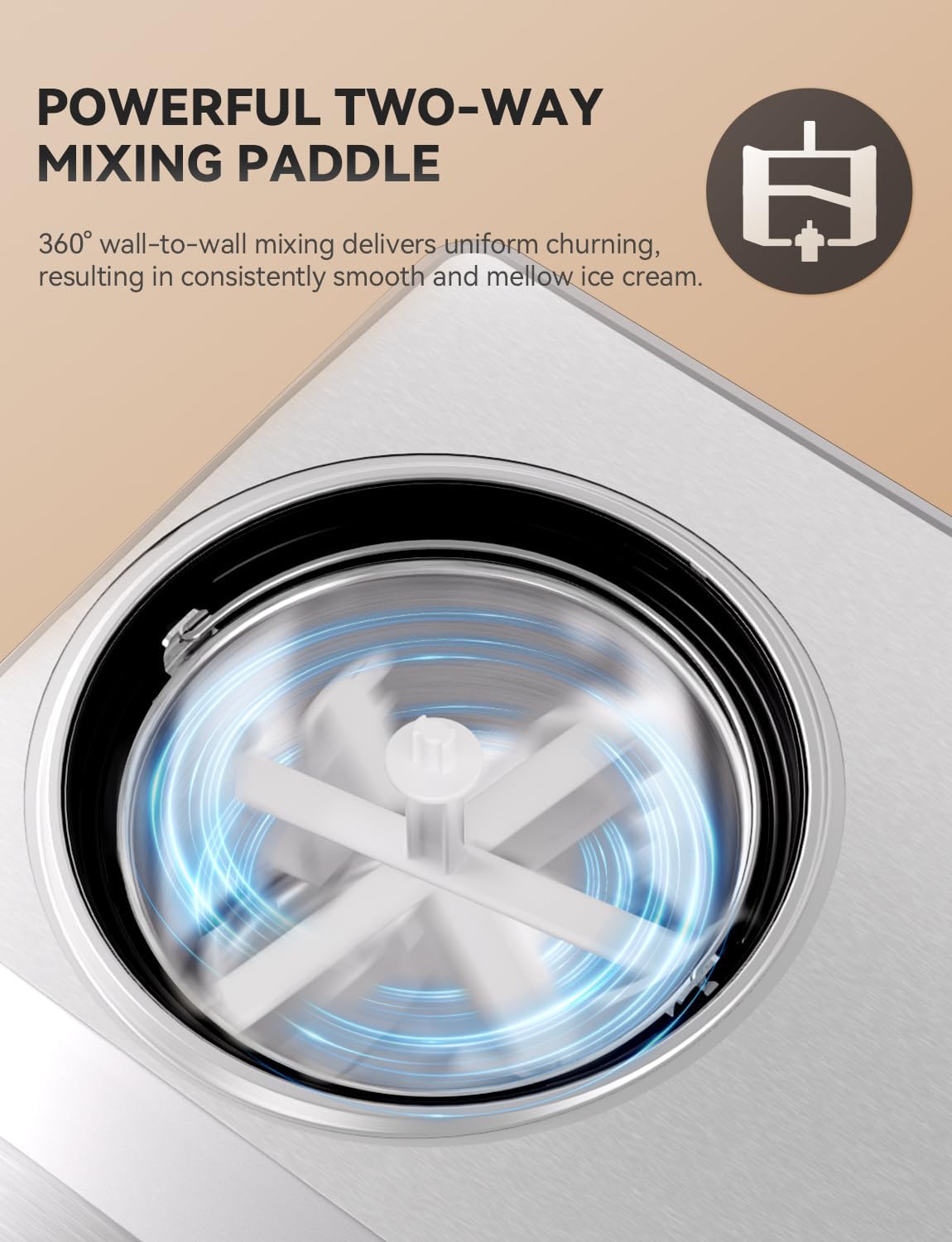 - 🍦Powerful Compressor for Ultra-Fast Cooling🍦 Powered by a high-efficiency compressor, this ice cream maker rapidly chills and churns without the need for overnight pre-freezing. Enjoy fresh, creamy ice cream in under an hour—optimum for last-minute desserts or spontaneous cravings.