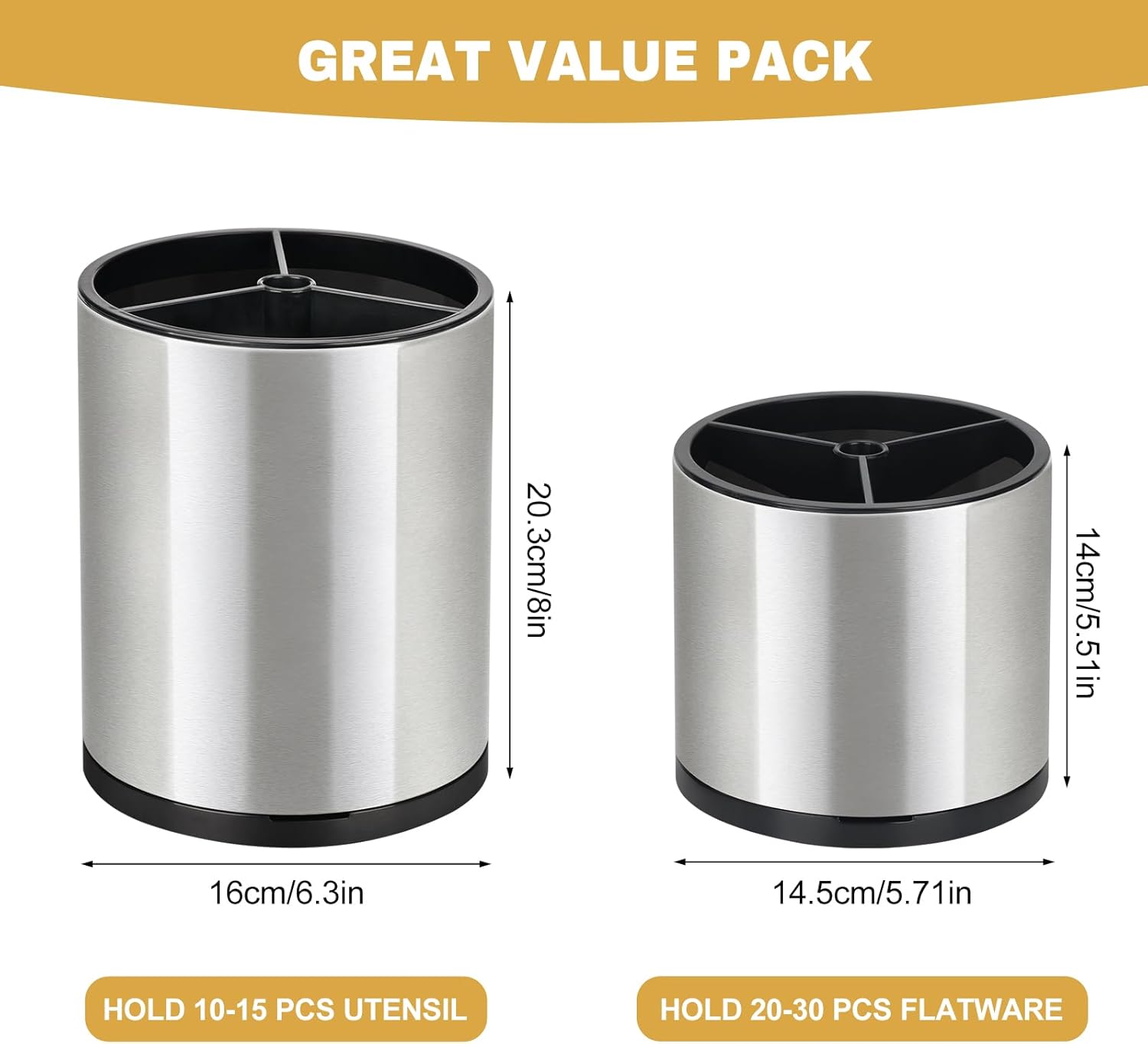 2Pack Kitchen Utensil Holder Set - 360° Rotating Stainless Steel Large Cooking Utensil Stand for Counter, 3 Compartment Flatware Caddy with Removable Base for Knife, Fork & Spoon Organizer - Sliver