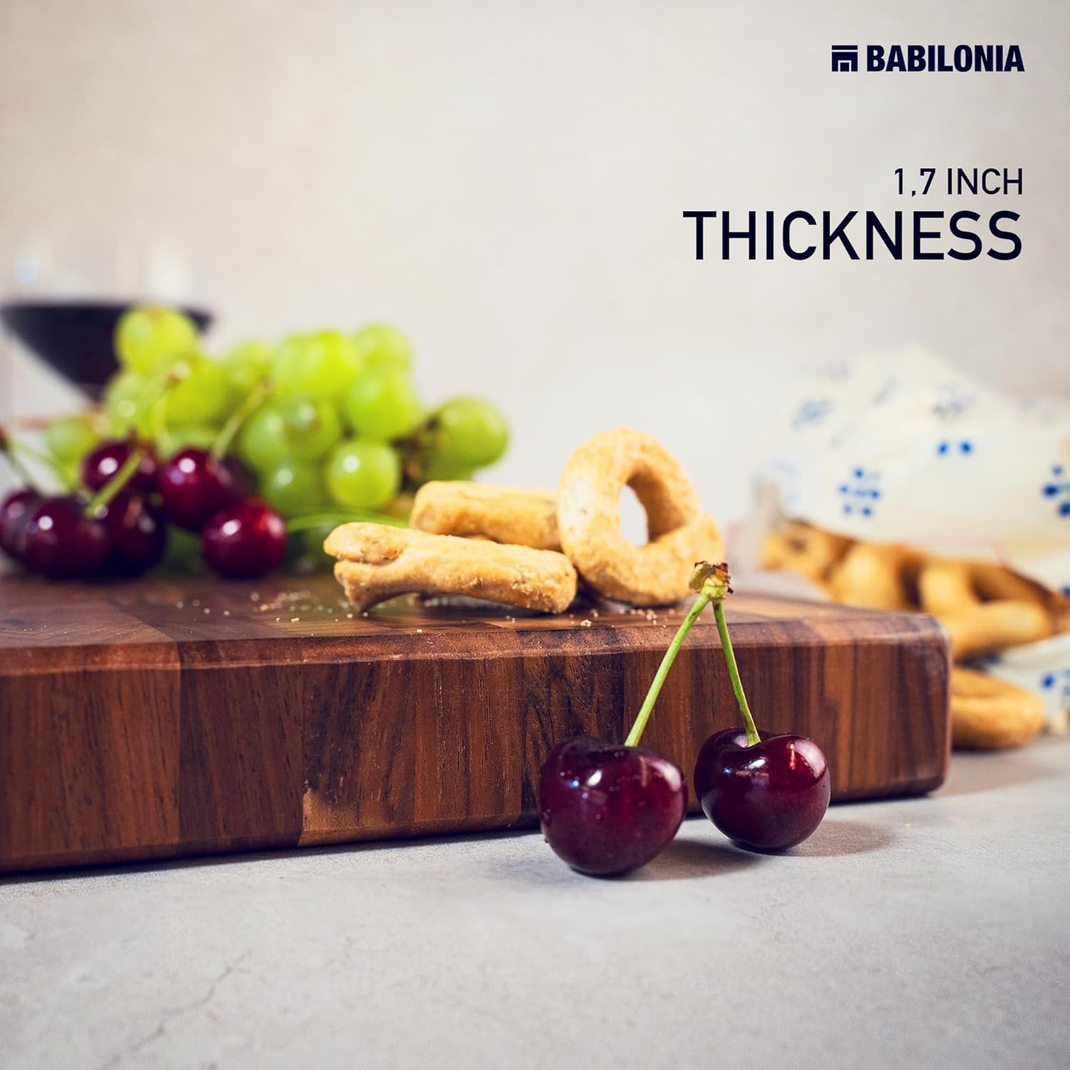 - SIMPLE & SOPHISTICATED DESIGN : Presenting our exclusive 3 in 1, butcher block / wood cutting board / serving board tray. Babilonia create an innovative design. In fact, you can use the notch and the plate to slide your chopped produce onto your pot or bowl. You will no longer need anymore to lift your cutting board for an onion. It will help to cook with pleasure and more ease. A beautiful product which will last you. It is also reversible to use as a serving tray (Hidden handle).