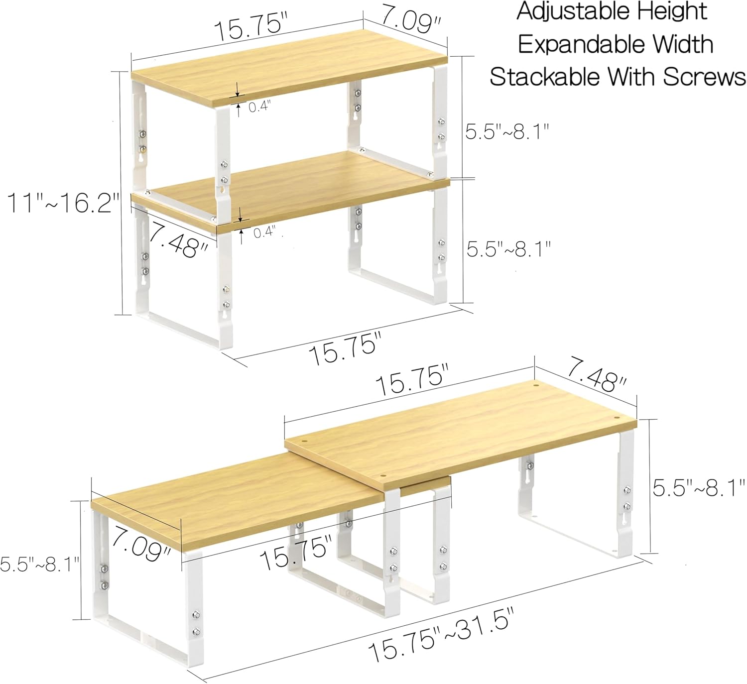 Expandable Kitchen Cabinet Organizer Shelves – Stackable Adjustable Metal and Wood Storage Racks for Countertop, Pantry, Garage Set of 2 Spice Rack – Easy Assembly, Space-Saving(1 Pack/Large/White)