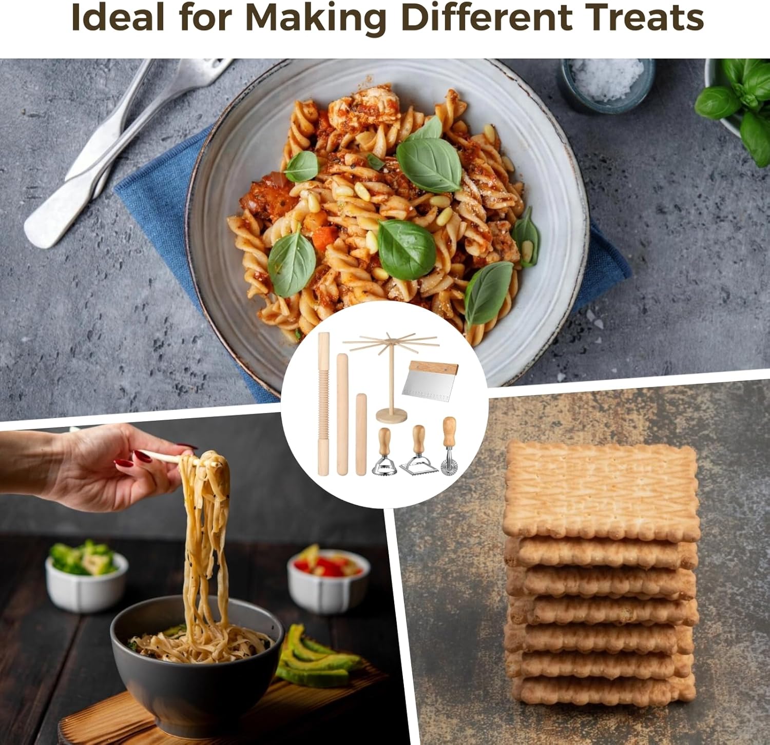- Complete Pasta-Making Kit: Includes 1 pasta drying rack, 1 dough cutter, 1 large rolling pin, 1 small rolling pin, 1 threaded rolling pin, 1 square pasta stamp, 1 round pasta stamp, and 1 ravioli cutter wheel; ideal for both novice and seasoned chefs.