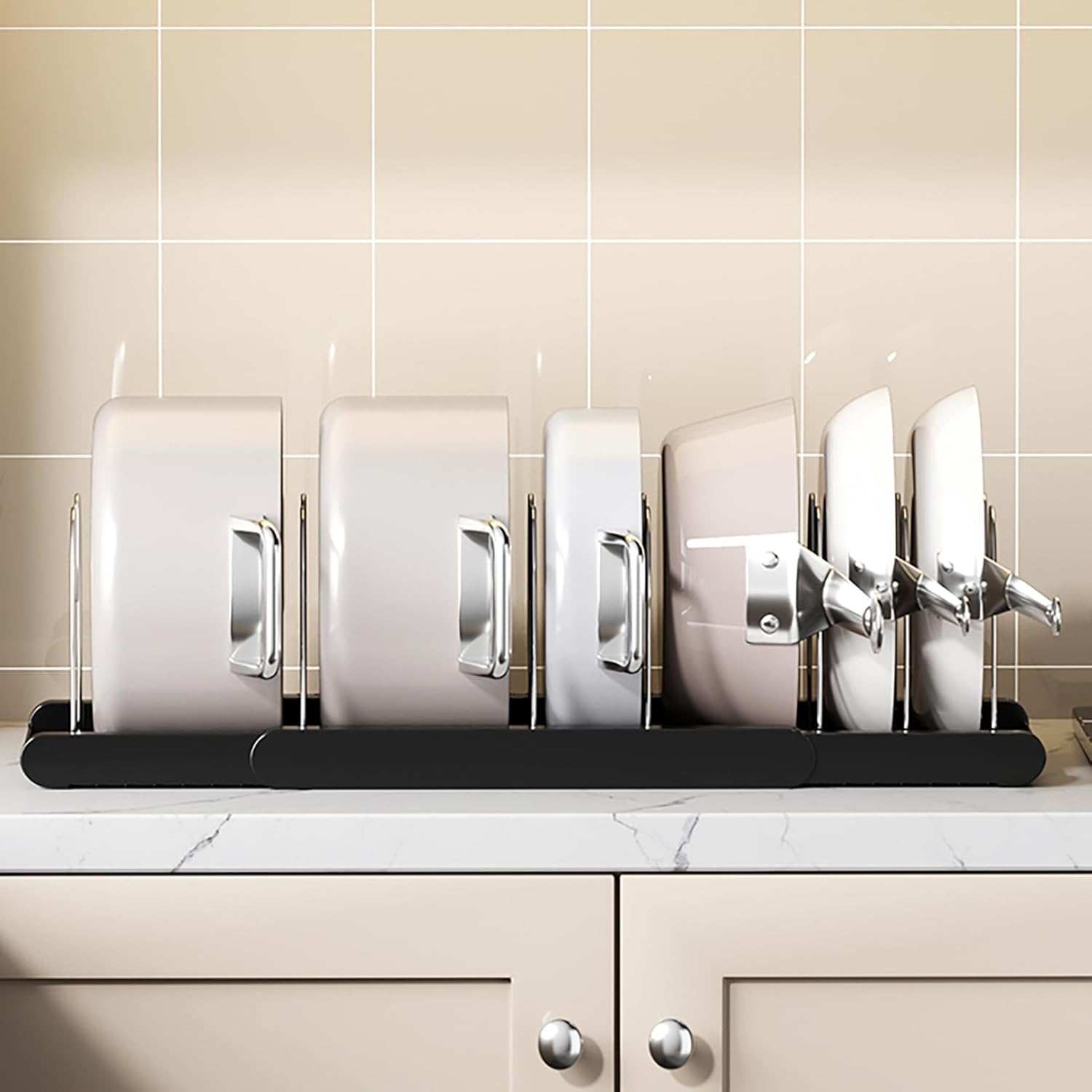 - 7 Adjustable Dividers made of 201 stainless steel; 7.5-inch width pots and pans organizer made of Sturdy ABS