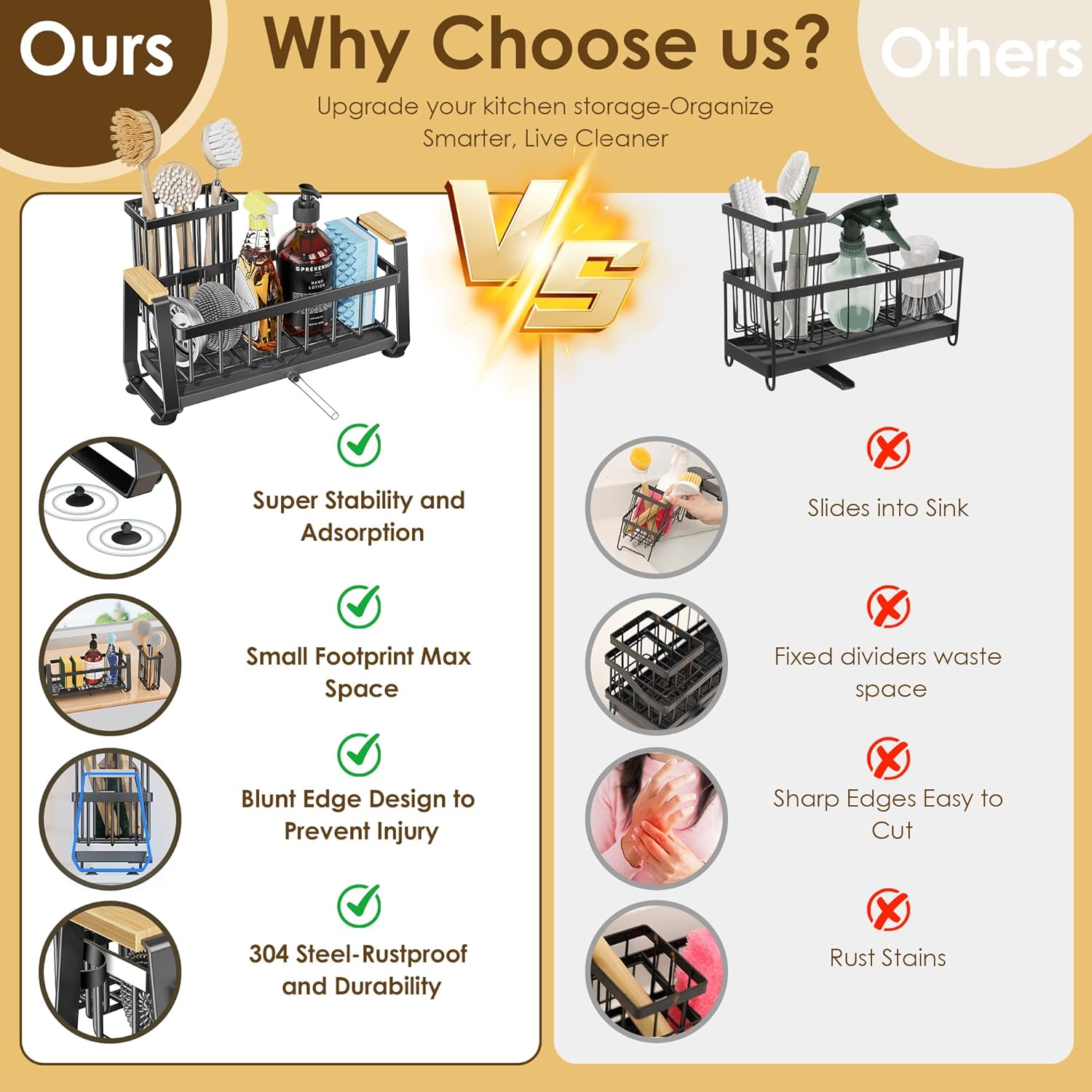 - ăRapid Self-DrainingăThe sink caddy kitchen sink organizer's patented V-Drain Channel and extra-long 3.15 in spout directs every drop straight to the sink. Keeps your kitchen sponge holder clean and dry. An Ideal kitchen organizers and storage for tidy countertops.