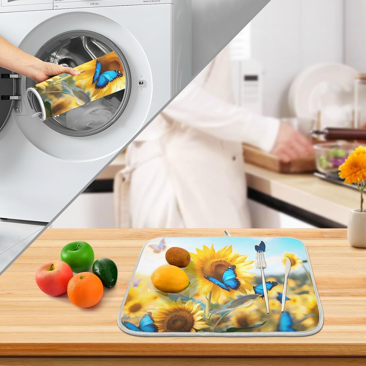 Blooming Sunflowers Blue Butterfly03 Dish Drying Mat for Kitchen Counter Absorbent Microfiber Large Drying Pad Dish mats for Kitchen Countertops 18 x 24 Inch