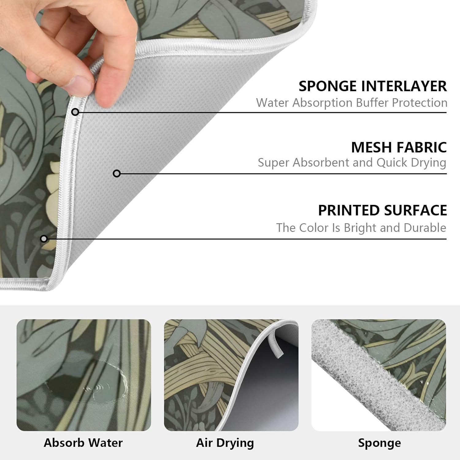 - Quick Drying Mat: Both sides of the dish drying mat are crafted with absorbent microfiber, the middle composite sponge material, made from over 50% recycled fibers, it absorbs several times its weight in liquid, keep kitchen counter dry
