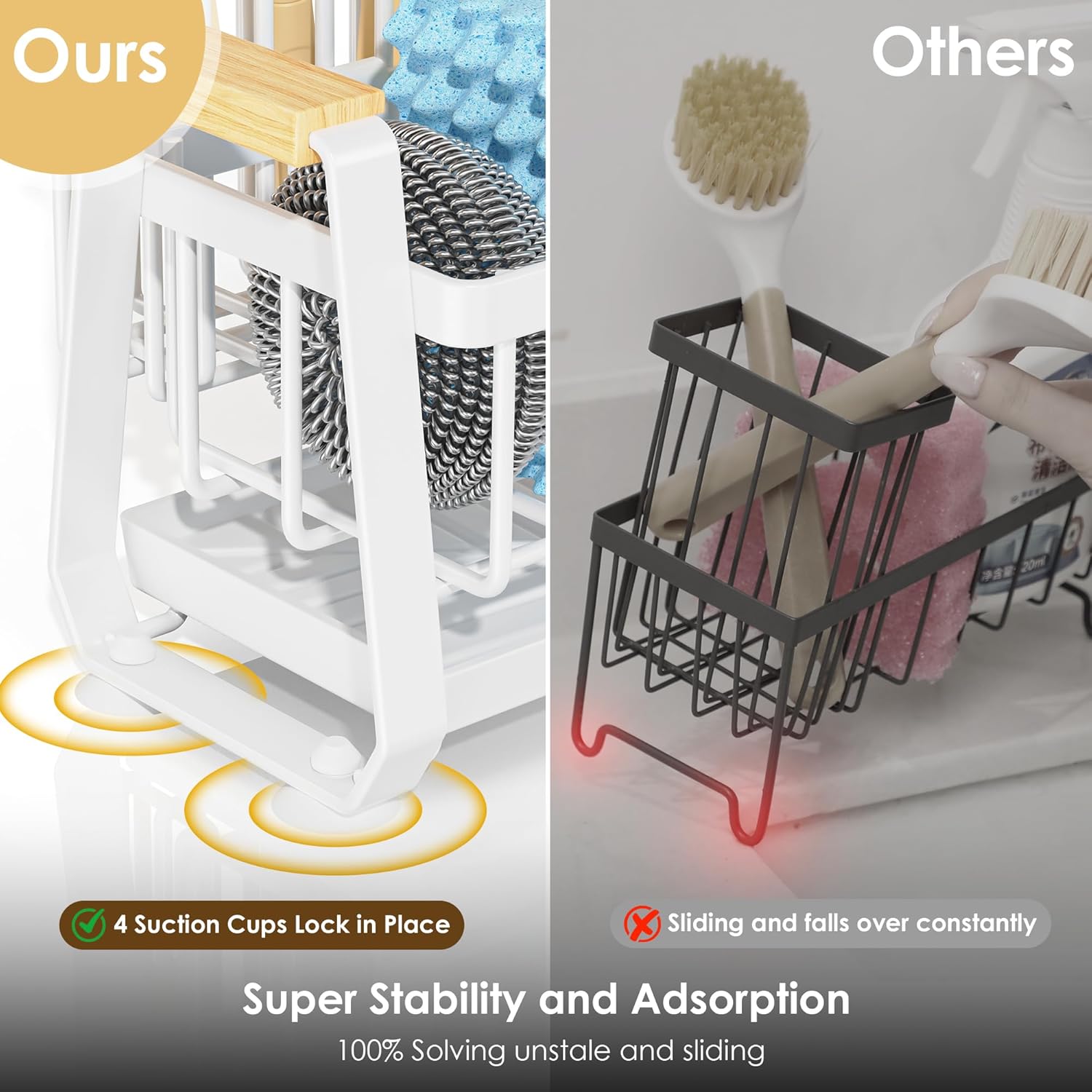 - ăShake-Proof StabilityăStays put through chaos,four industrial-strength rubber suction cups grip like a gecko, ensuring shake-proof stability on marble, granite, or glass-no slips, no falls, even when scrubbing fiercely or kids crash into the kitchen countertop!