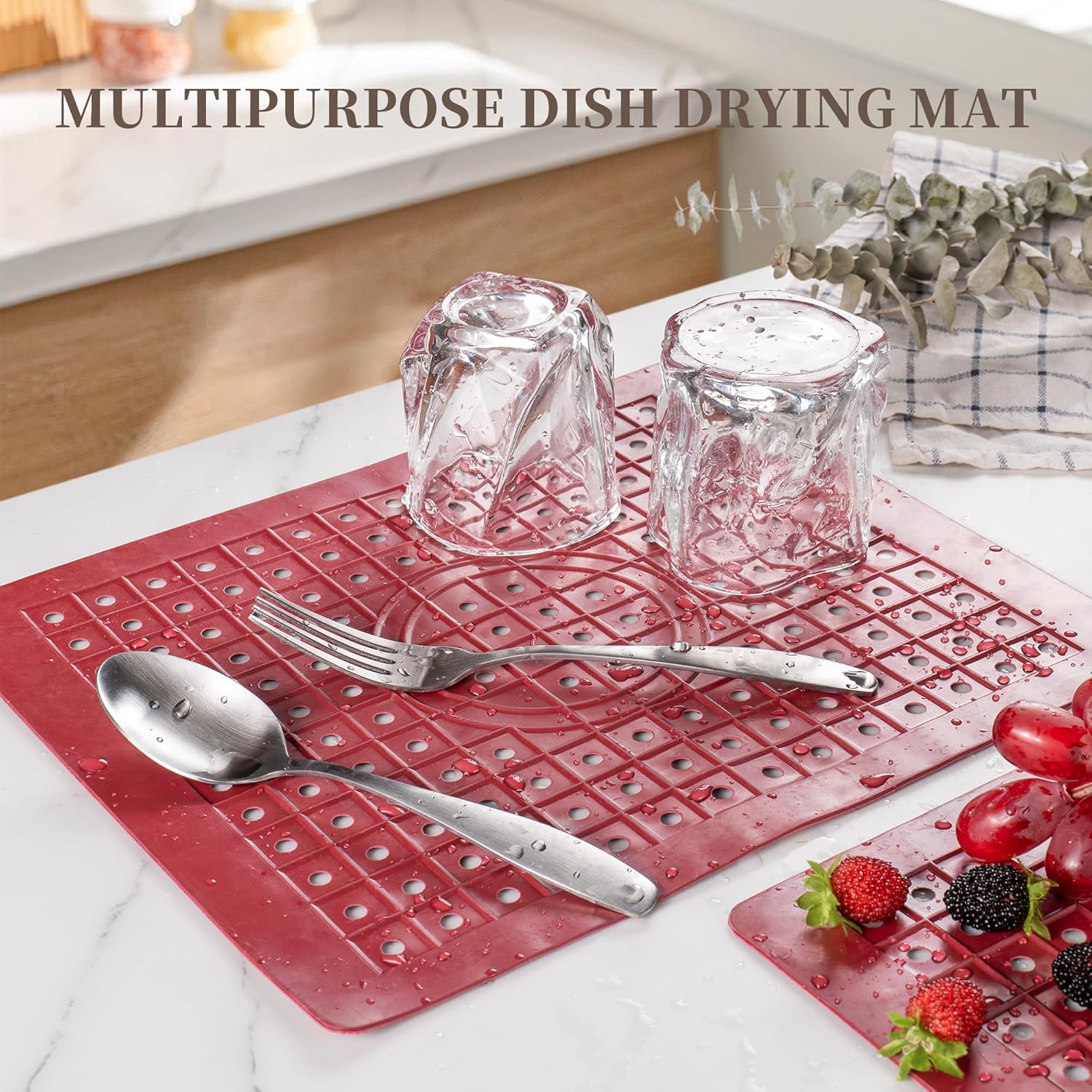 WILLKOMMEN Kitchen Sink Mat, 12" x 10" Rectangular Sink Protector Pad, Fast-Draining Grid Design Liner, Dish Drying Mat 2 Pack Red