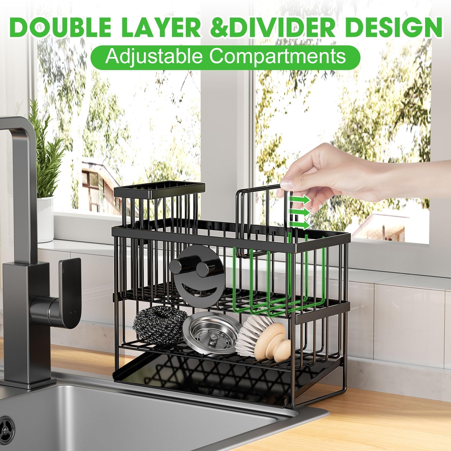 - ăDouble Capacityă The double-deck design makes the capacity bigger, can be used to store all kinds of hand sanitizers, sponges, dishwashing brushes, soaps and sink plugs, etc., space-saving, suitable for kitchens with limited space, make your kitchen countertop cleaner and neater.