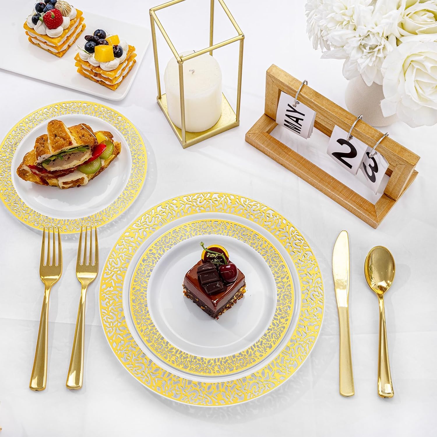 I00000 200 Pieces White and Gold Plastic Plates, Disposable Plastic Plates for 100 Guests Include: 100 Pcs Dinner Plate 10.25” and 100 Pcs Dessert Plate 7.5” with Gold Lace Rim Perfect for Party