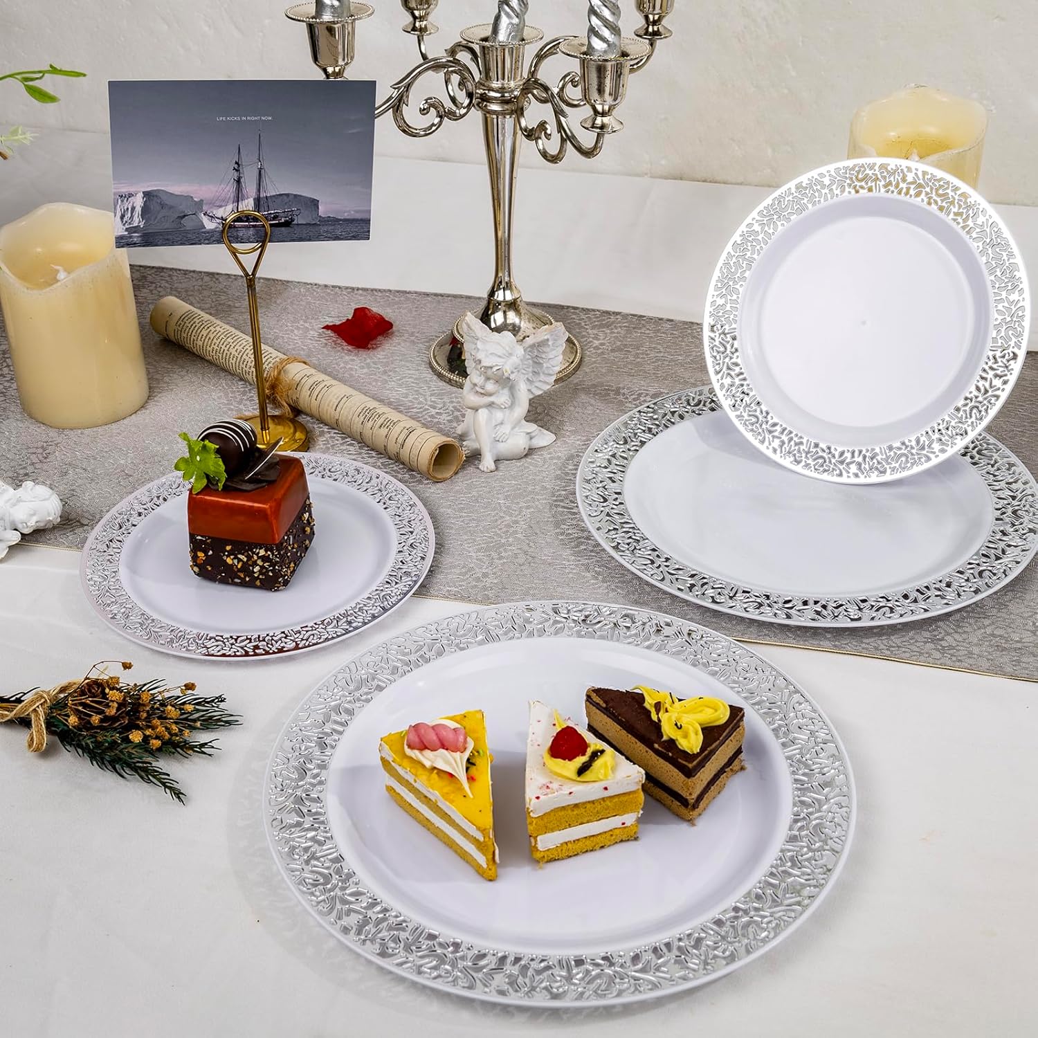 I00000 200 Pieces Silver Plastic Plates, Disposable Plastic Plates for 100 Guests Include: 100 Pcs Dinner Plate 10.25” and 100 Pcs Dessert Plate 7.5” with Silver Lace Rim Perfect for Wedding & Party