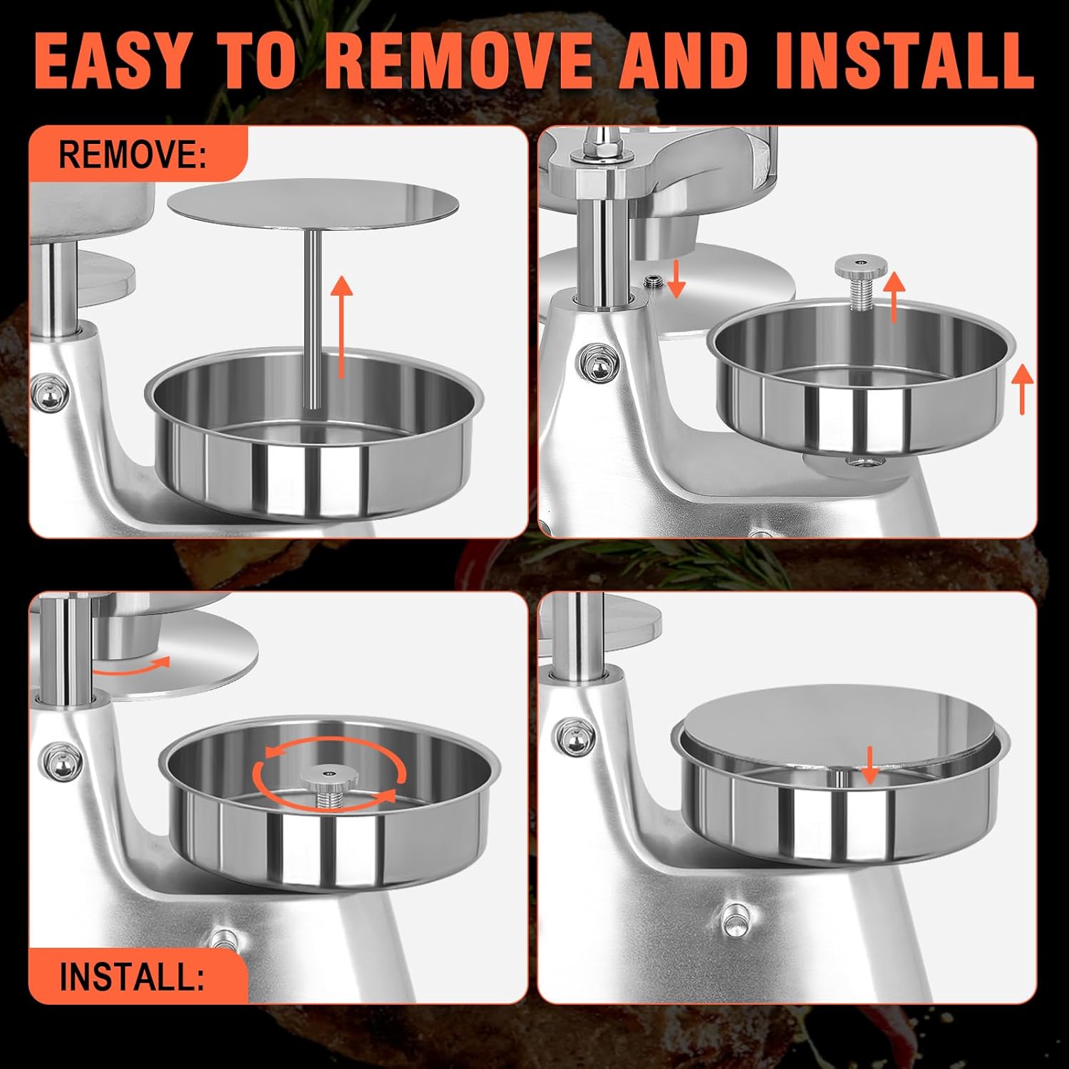 - 【3-in-1 Multifunctional Hamburger Patty Machine】 The burger patty press machine is equipped with three commonly used sizes of trays, which can make patties of 4 inches (100mm), 5 inches (13mm), and 6 inches (15mm) sizes, which can easily satisfy your multiple needs. And the tray is simple and easy to change, just rotate the tray to change.