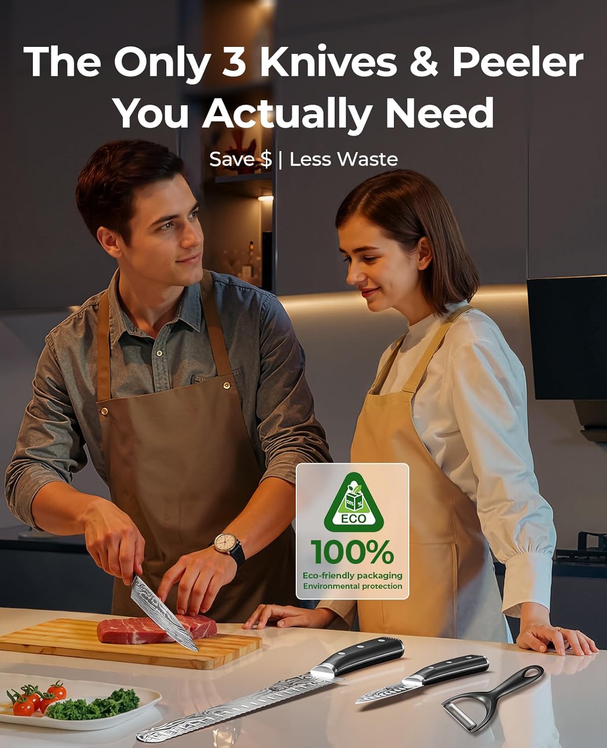 - 1.【Only 4-Piece Set Handles All Kitchen Task 】 — Designed for small families and singles, our basic 4-piece forged kitchen knife set (Chef's Knife, Bread Knife, Paring Knife + Vegetable Peeler) conquers 95% of daily cooking. From cutting meat and slicing bread to peeling kiwis and coring strawberries, this chef-approved knives set for kitchen eliminates the need for redundant tools. Why clutter your kitchen with 14 blades when 4 essential sets can do it all? Save $100+ while enjoying restaurant-grade performance in your home kitchen.