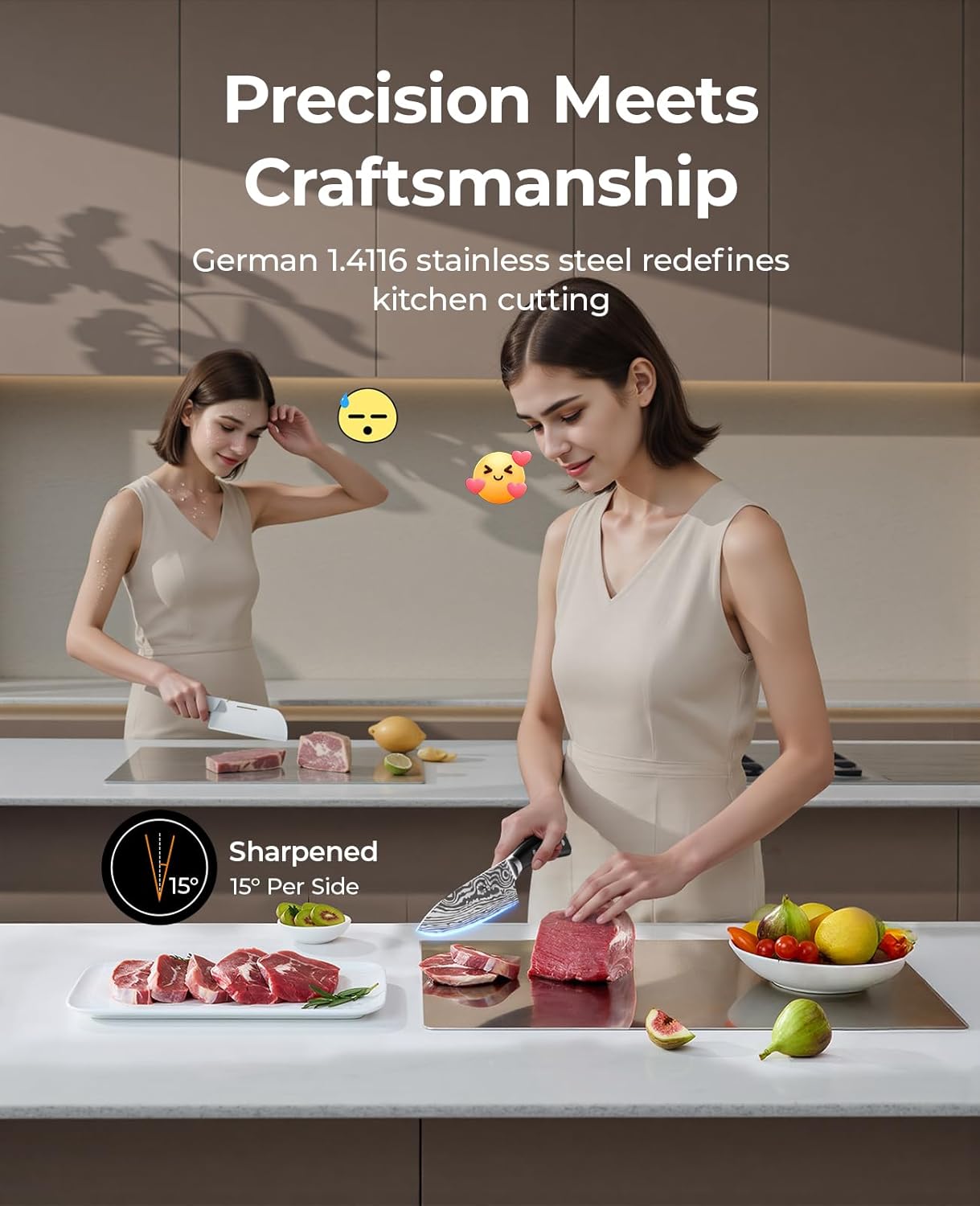 - 3.【Unmatched Sharpness & Durability 】 — Forged from premium German 1.4116 high carbon stainless steel, each knife undergoes high-temperature vacuum tempering and cryogenic nitrogen treatment to achieve a hardness of 56+ HRC. This ensures excellent corrosion resistance, sharp edge retention, and toughness. Hand-sharpened to a precise 15° Japanese edge on both sides for ultra-sharp performance. Combining exceptional sharpness with long-lasting durability, it delivers effortless precision — perfect for both right- and left-handed users.