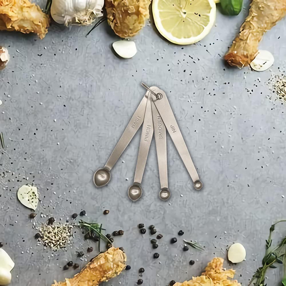 - EASY TO STORE: Set Contains 4 spoons: nip-1/64-tsp, smidgen-1/32-tsp, pinch-1/16-tsp, dash-1/8-tsp. Conveniently connected by a O ring which helps to keep the spoons together after a full day of baking or cooking